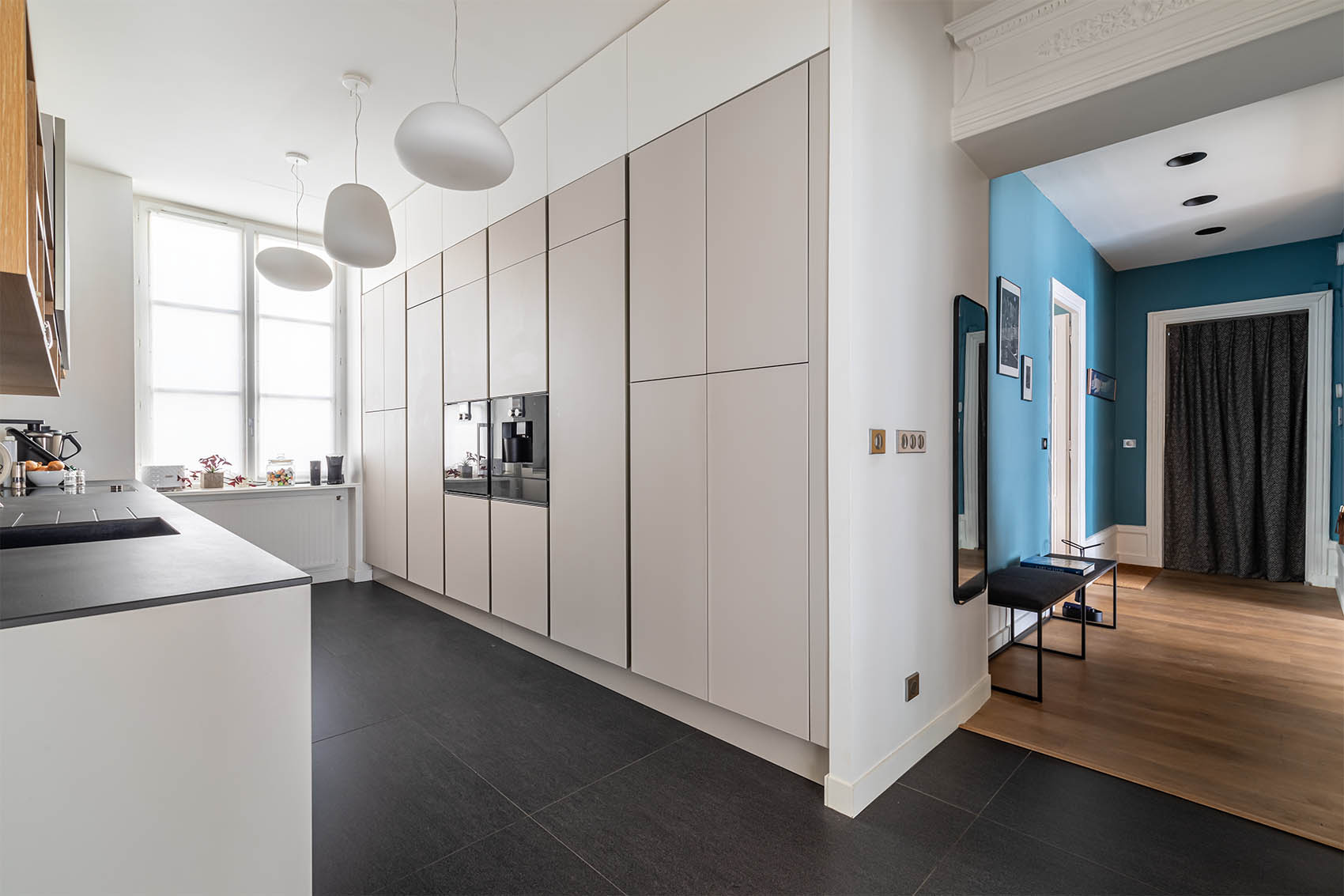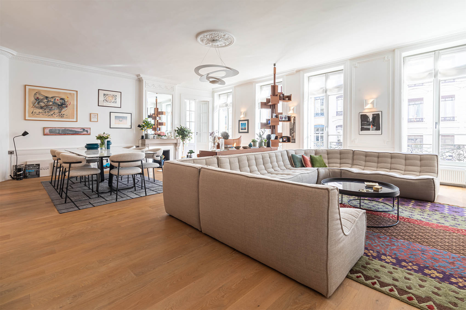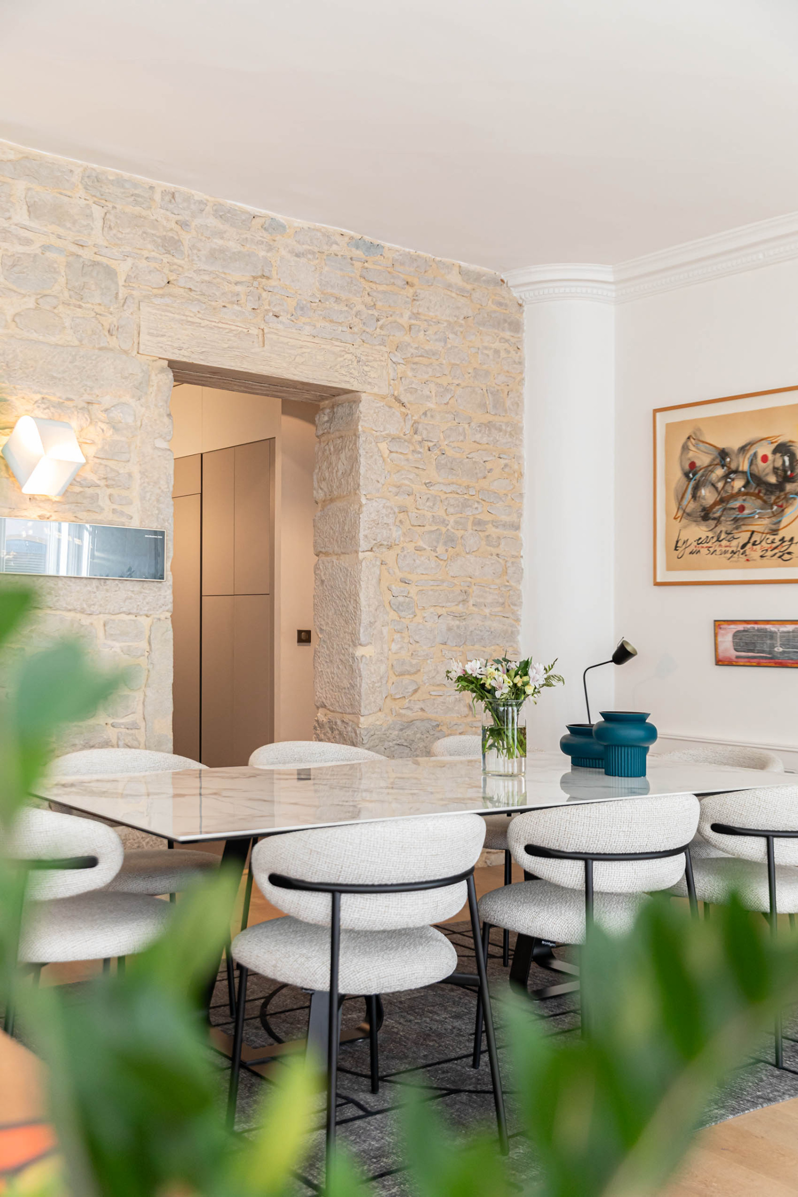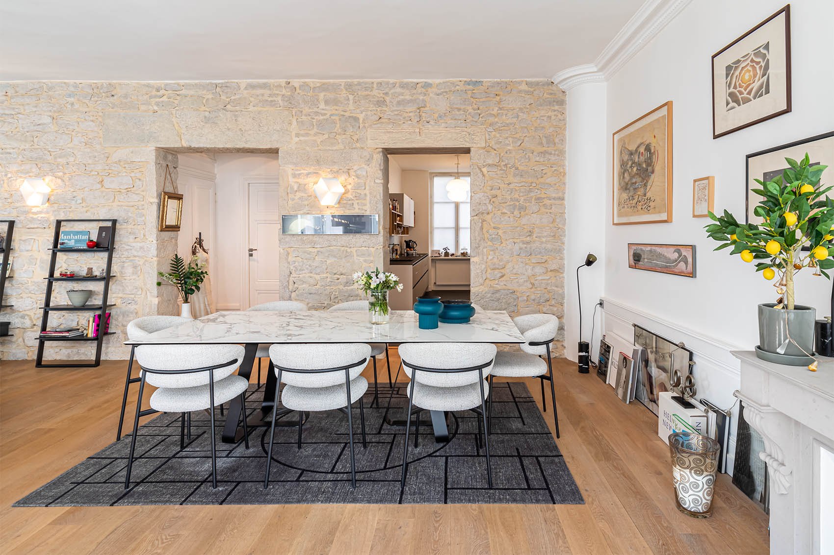 Vous serez immediatements séduits par le charme de l'appartement (mur en pierre, moulures, cheminées), ses volumes (pièce de vie de 61 m²) et la qualité de sa rénovation et de ses prestations.
