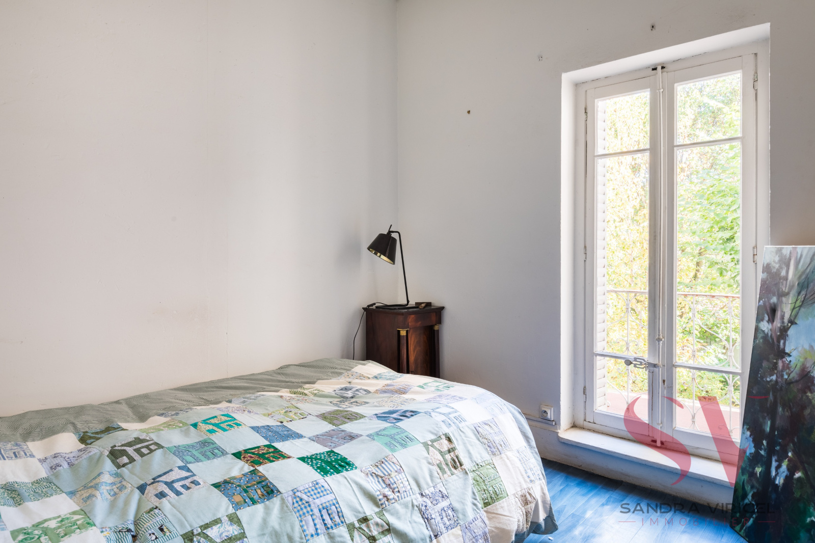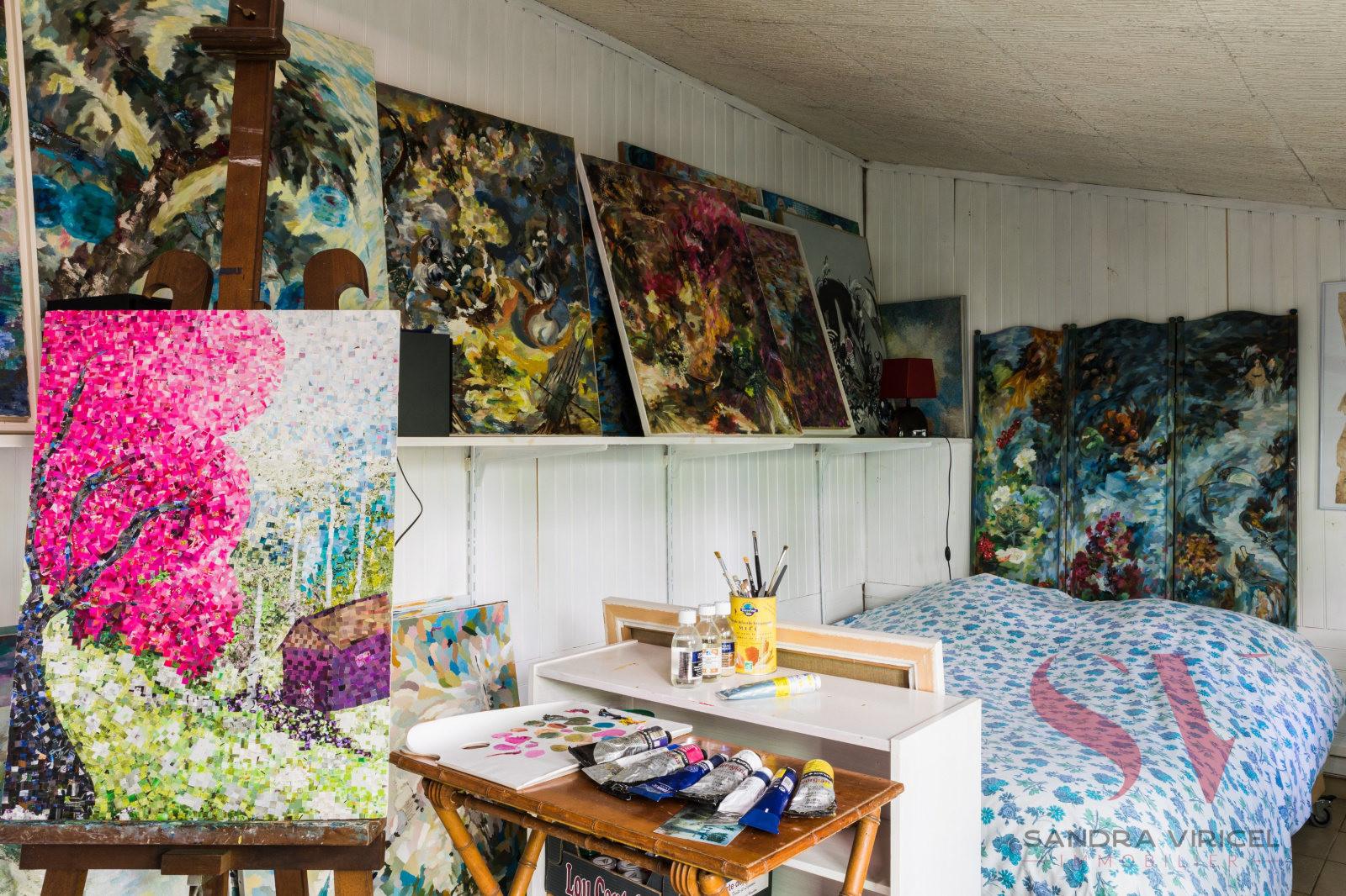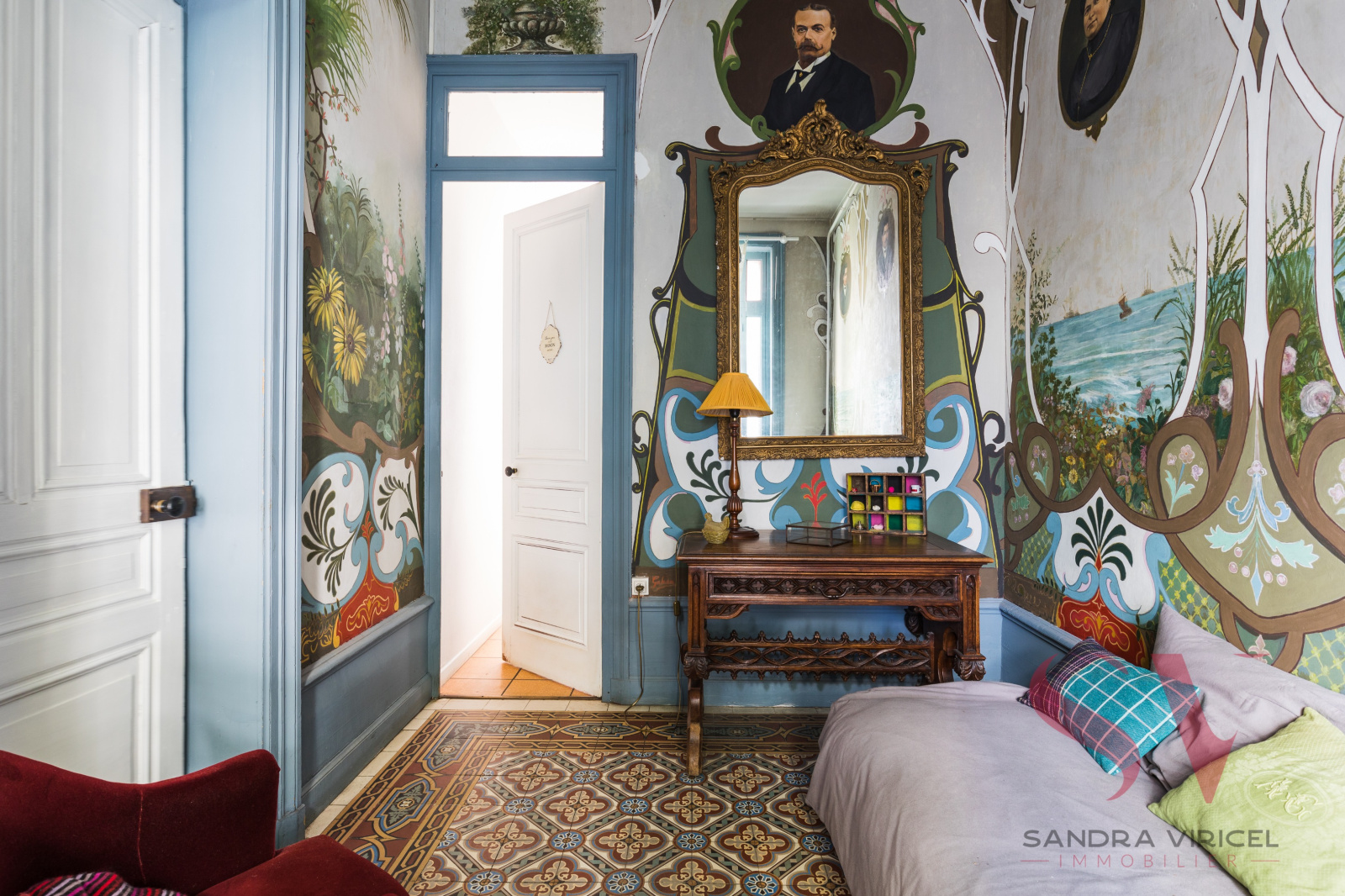 A l'étage 3 chambres, 1 bureau et un petit salon avec une magnifique fresque au mur, une salle de bains.