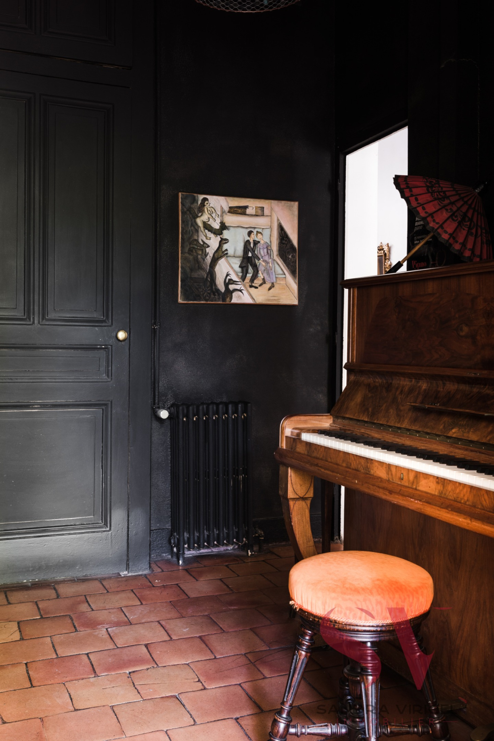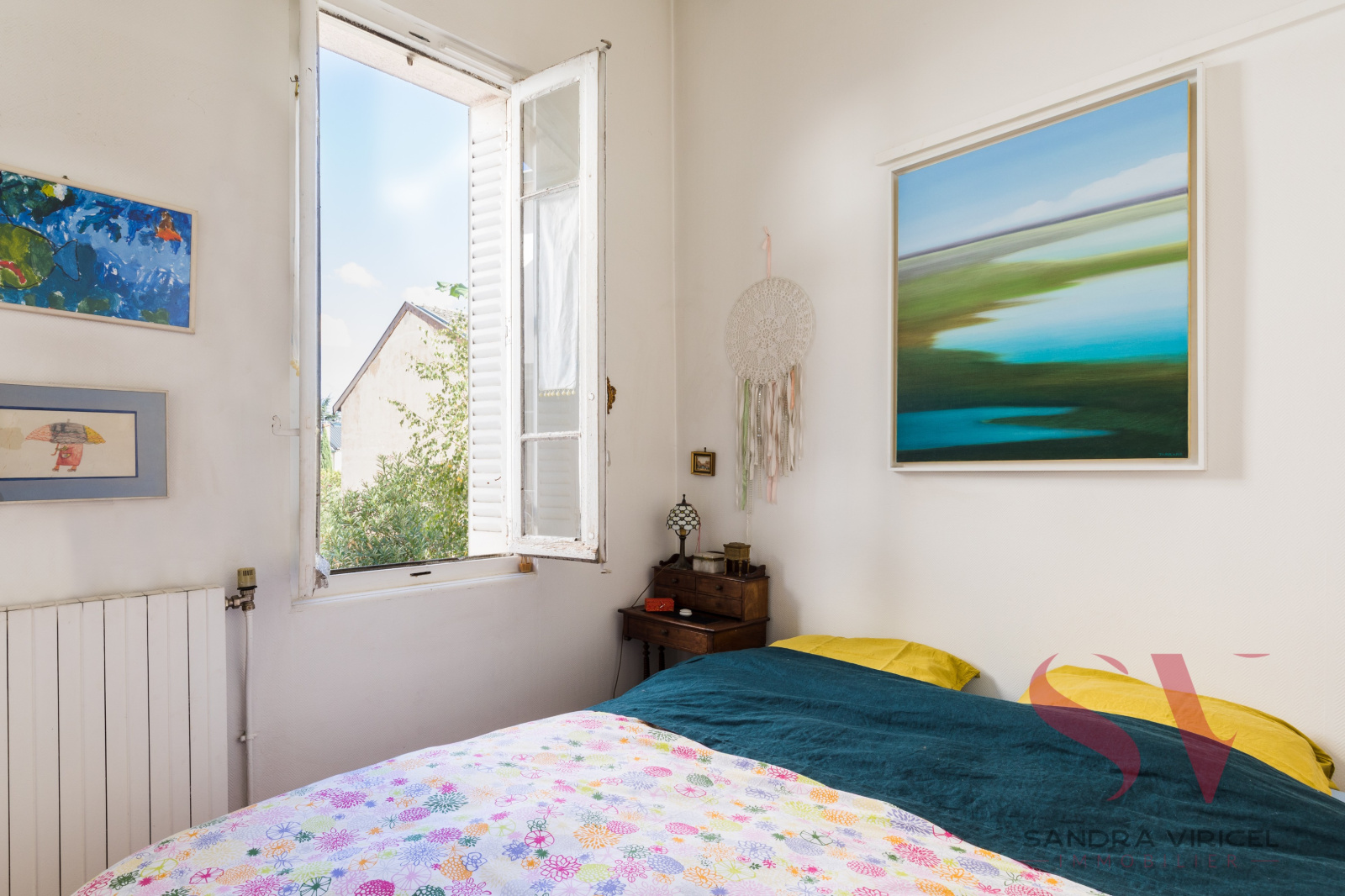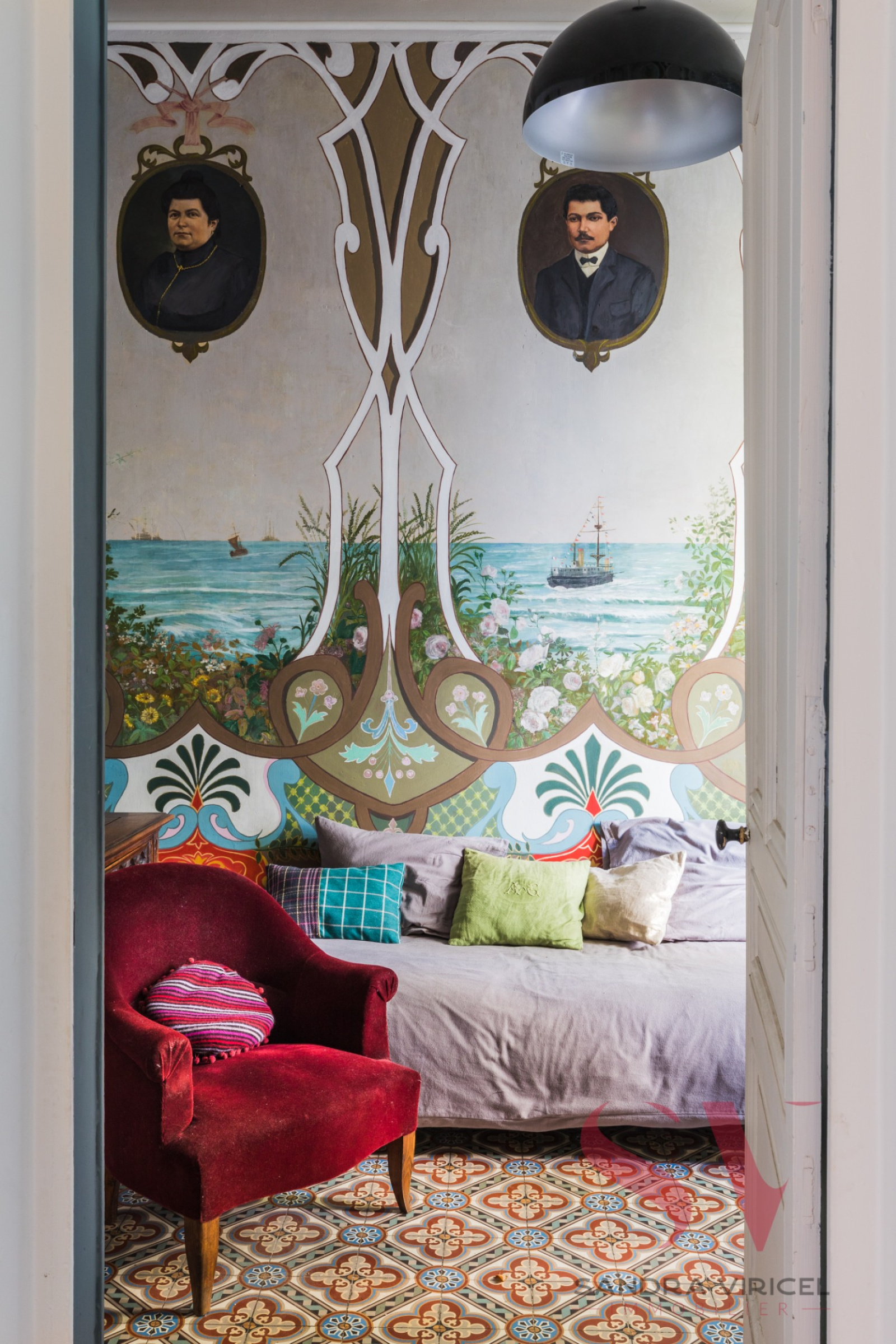 A l'étage 3 chambres, 1 bureau et un petit salon avec une magnifique fresque au mur, une salle de bains.