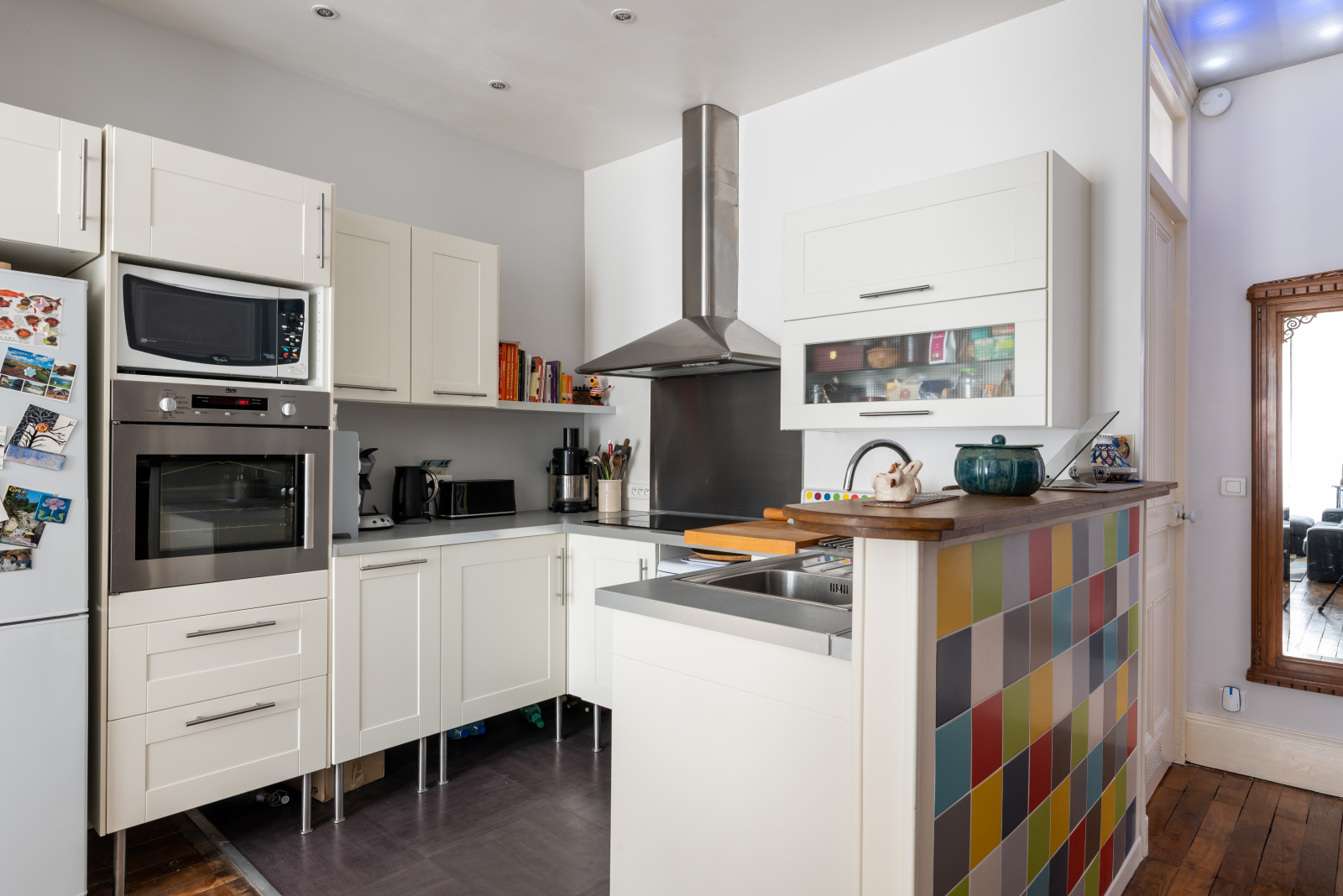 L'appartement bénéficie d'un séjour orienté Ouest avec cuisine ouverte équipée, de 2 grandes chambres dont une sur cour intérieure, d'une salle de bain et d'un WC séparé.