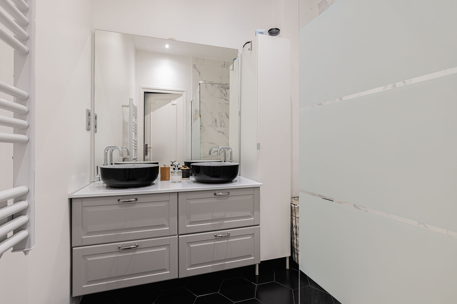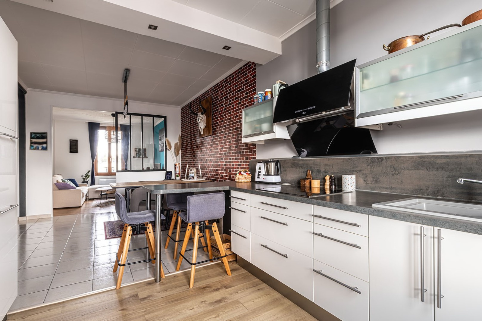 L’appartement se compose d’une entrée avec rangements, d’une grande pièce de vie chaleureuse avec une grande cuisine équipée ouverte sur un espace repas et un salon convivial, semi-séparés par une élégante verrière. Une buanderie apporte un vrai côté pratique au quotidien. La partie nuit accueille deux chambres disposant chacune de placards intégrés, ainsi qu’une salle d’eau moderne avec douche à l’italienne et double vasque. Le wc est indépendant.