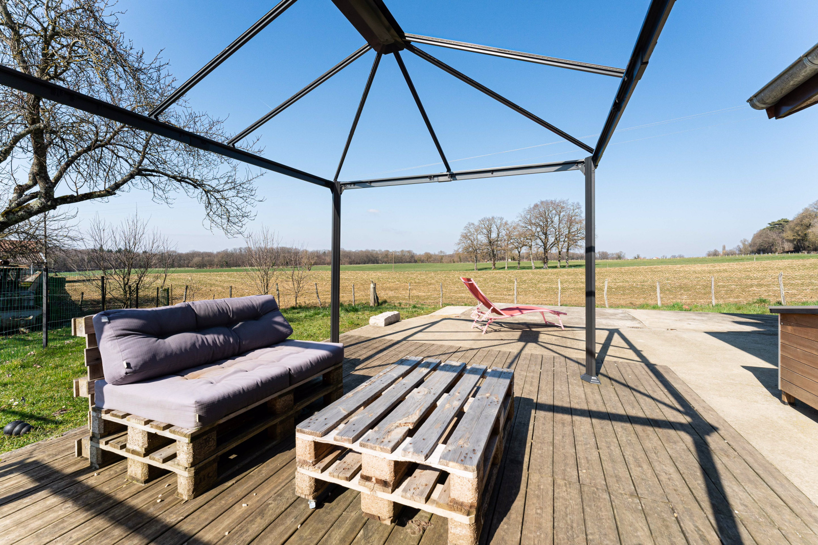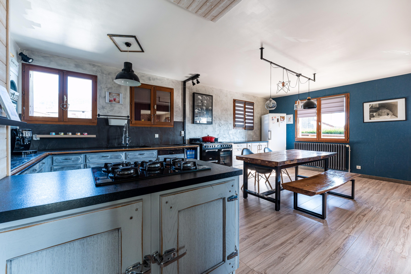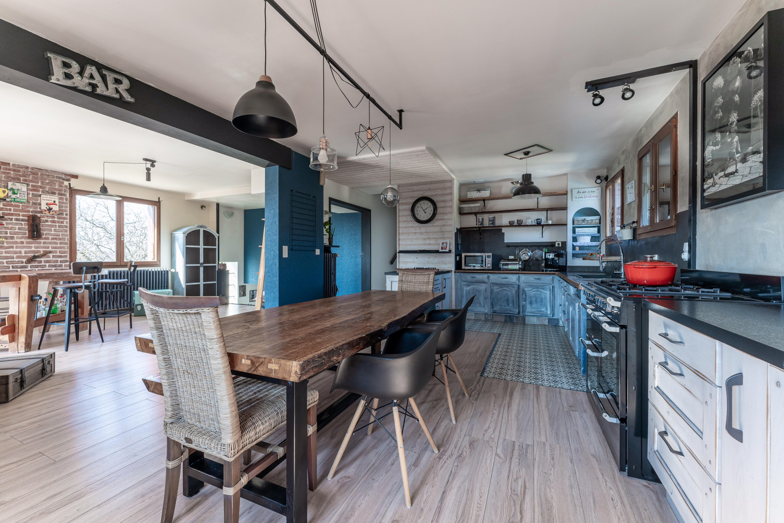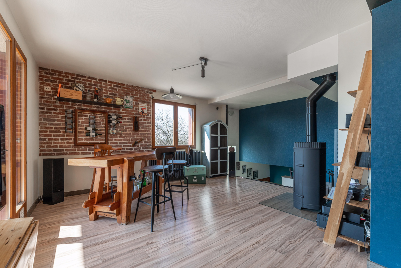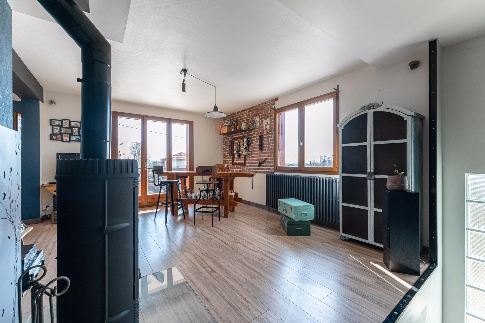 Hors dépendance, la maison se compose à l'étage, d'une très grande pièce de vie, avec une cuisine ouverte sur un espace repas et un espace détente. Cet ensemble est équipé d'un poêle à bois. Au même niveau, un salon, deux chambres, une salle d'eau, et un WC independant.
