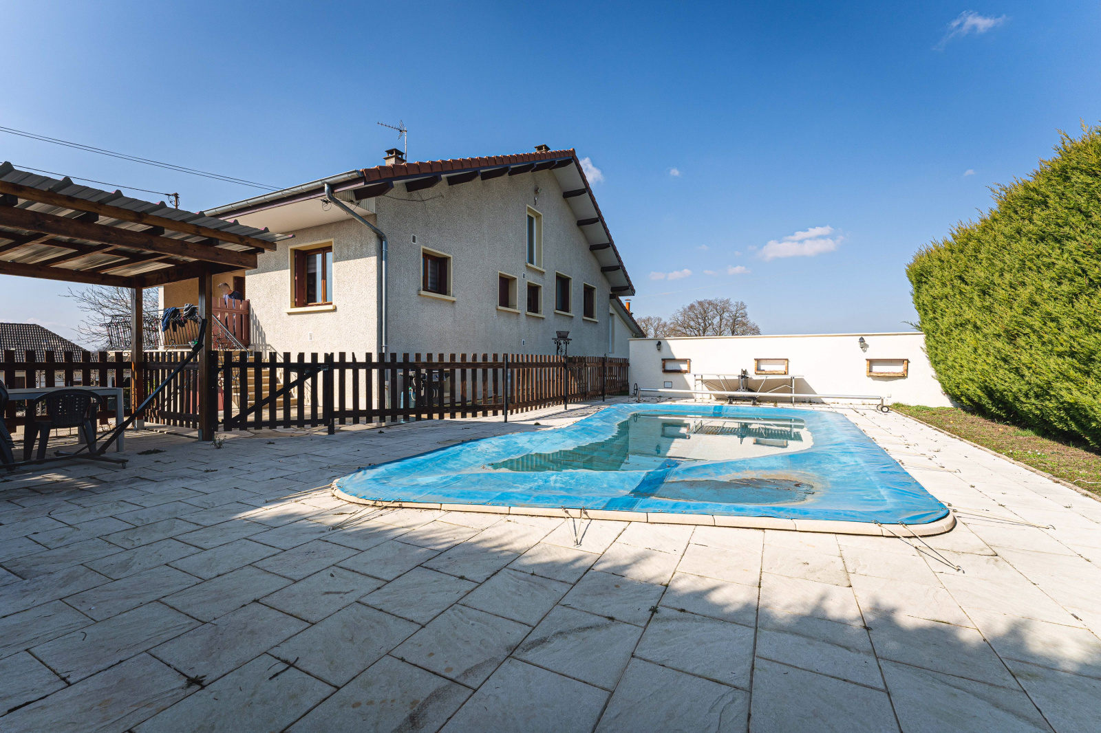 Ceyzériat (01250)L'agence Sandra Viricel Immobilier vous propose en exclusivité cette grande maison familiale des années 70, d'environ 190 m2 habitable, dont 1 dépendance de 55 m2, qui dispose d'une grande pièce de vie en rez-de-chaussée, une chambre, une salle de bain et un WC à l'étage (possibilité location), le tout sur un terrain plat arboré de 1 500 m2, avec une piscine.
