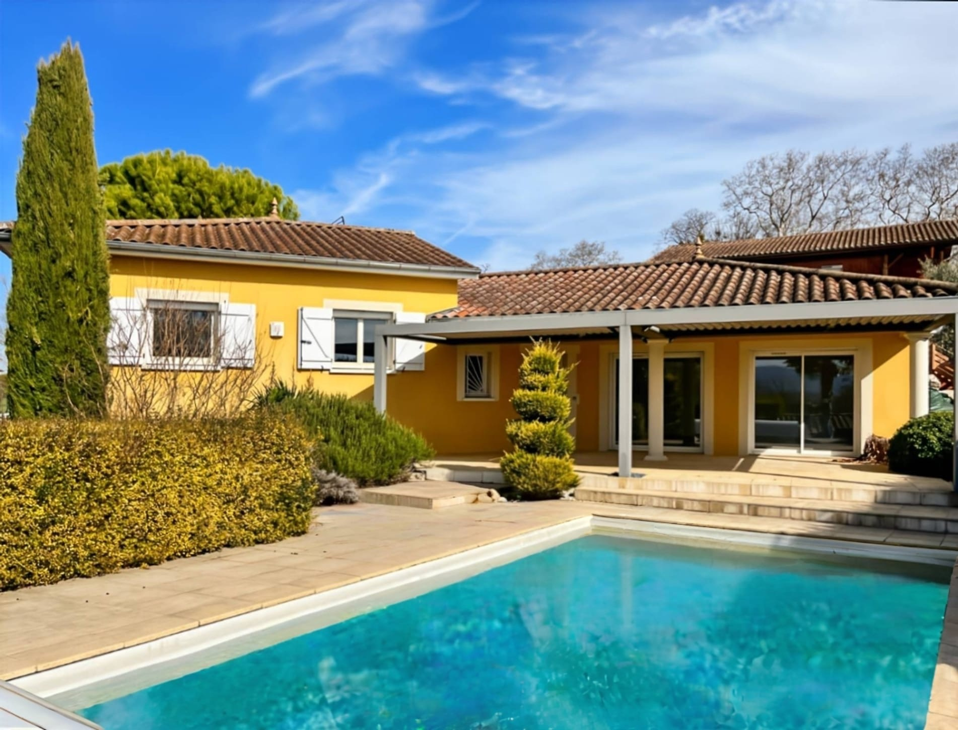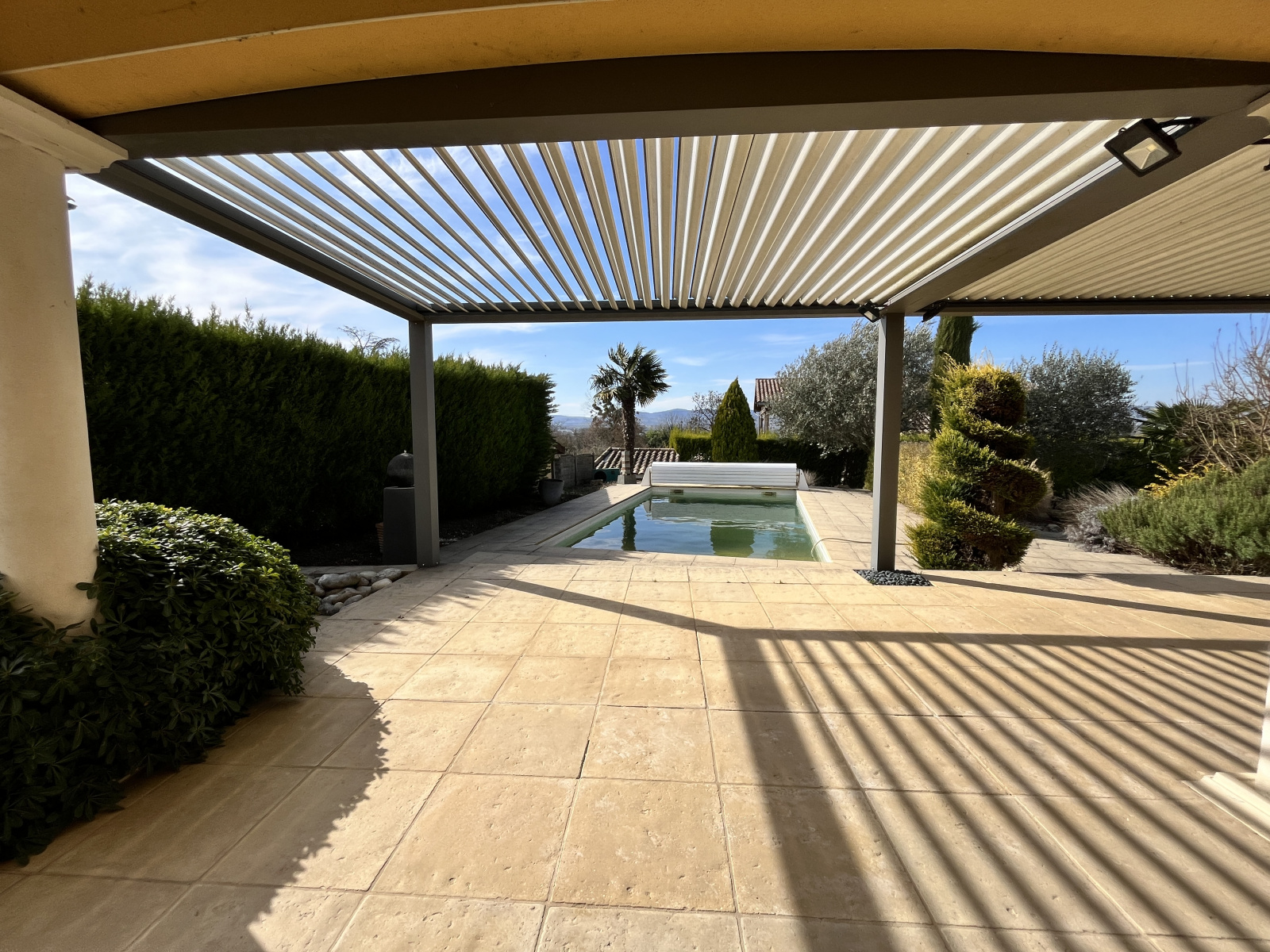 Côté jardin, c'est le calme absolue, vue sur les monts du Beaujolais, le terrain paysagé offre cadre de détente avec la piscine chauffée.