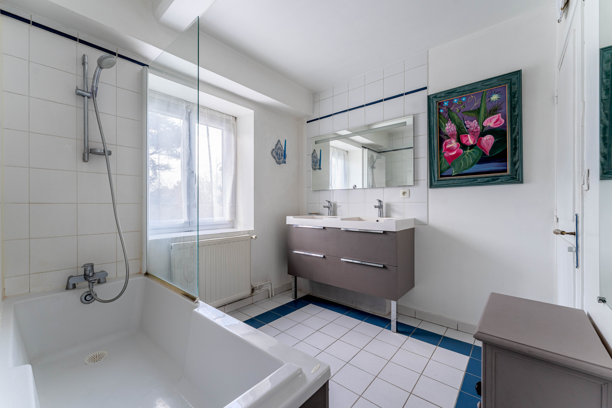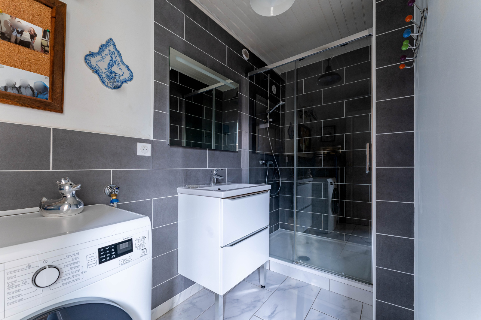 À l’étage, trois chambres dont une suite parentale climatisée, une salle de bains avec coin buanderie et des toilettes indépendantes.