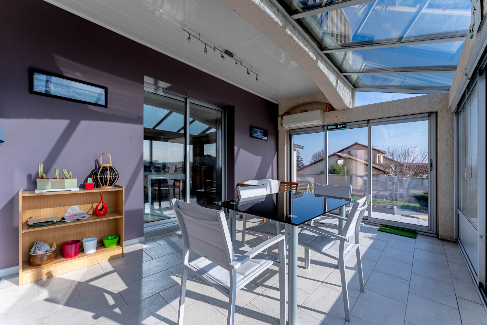 Une véranda orientée plein sud laisse entrer la lumière ainsi que les baies vitrées à galandages.