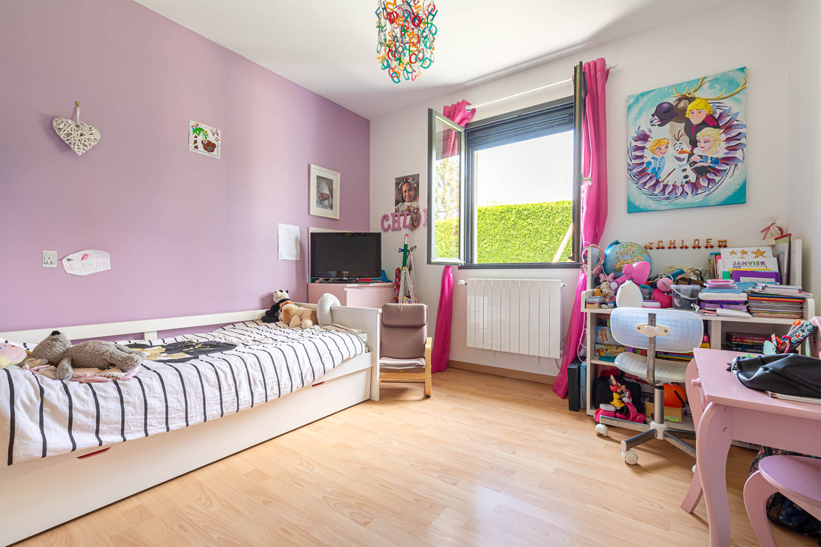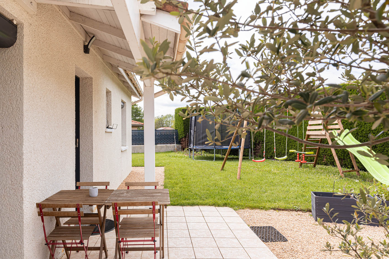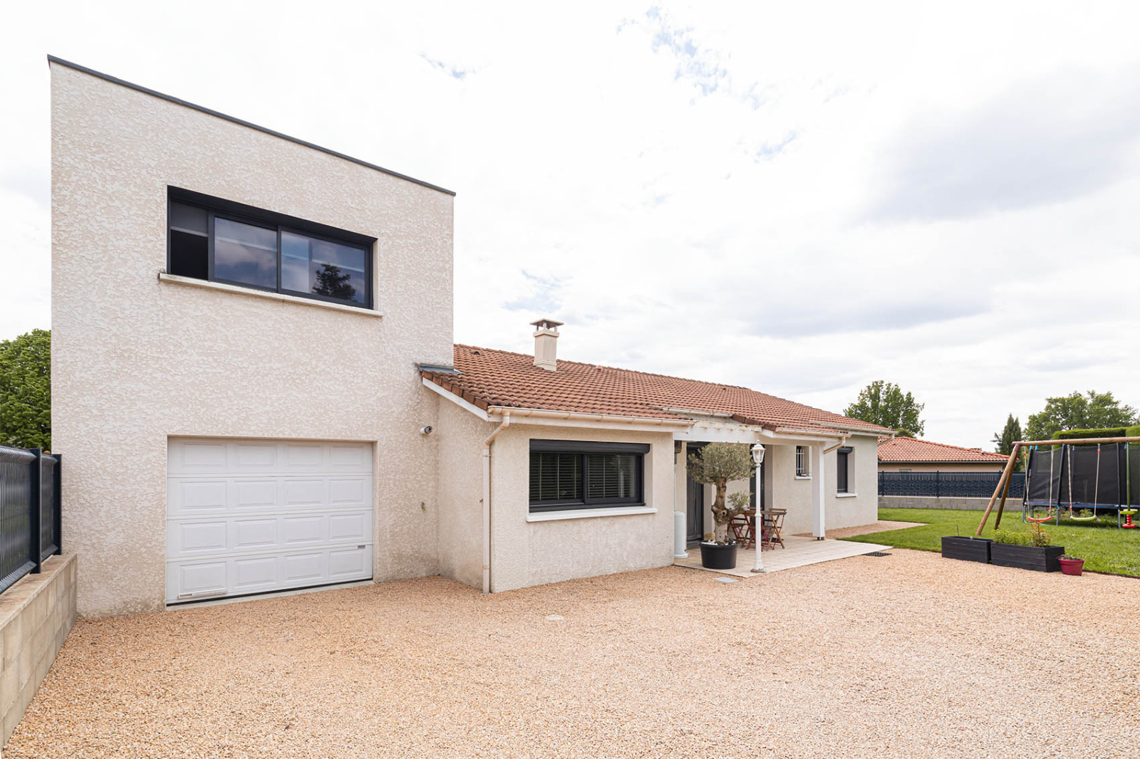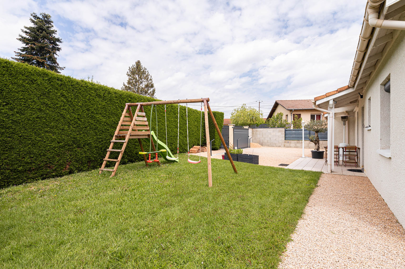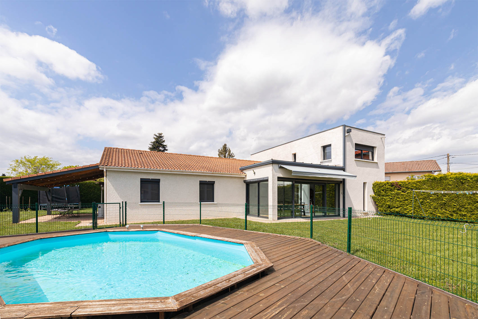 Côté jardin, sur un terrain plat de 805m2 entièrement cloturé, une piscine, une terrasse à l'abris des regards, et de quoi stationner vos voitures.