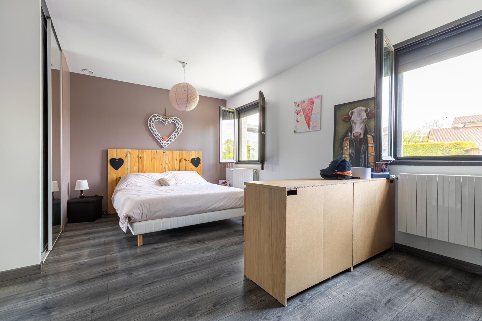A l'étage, deux grandes chambres, une salle de douche et un wc.