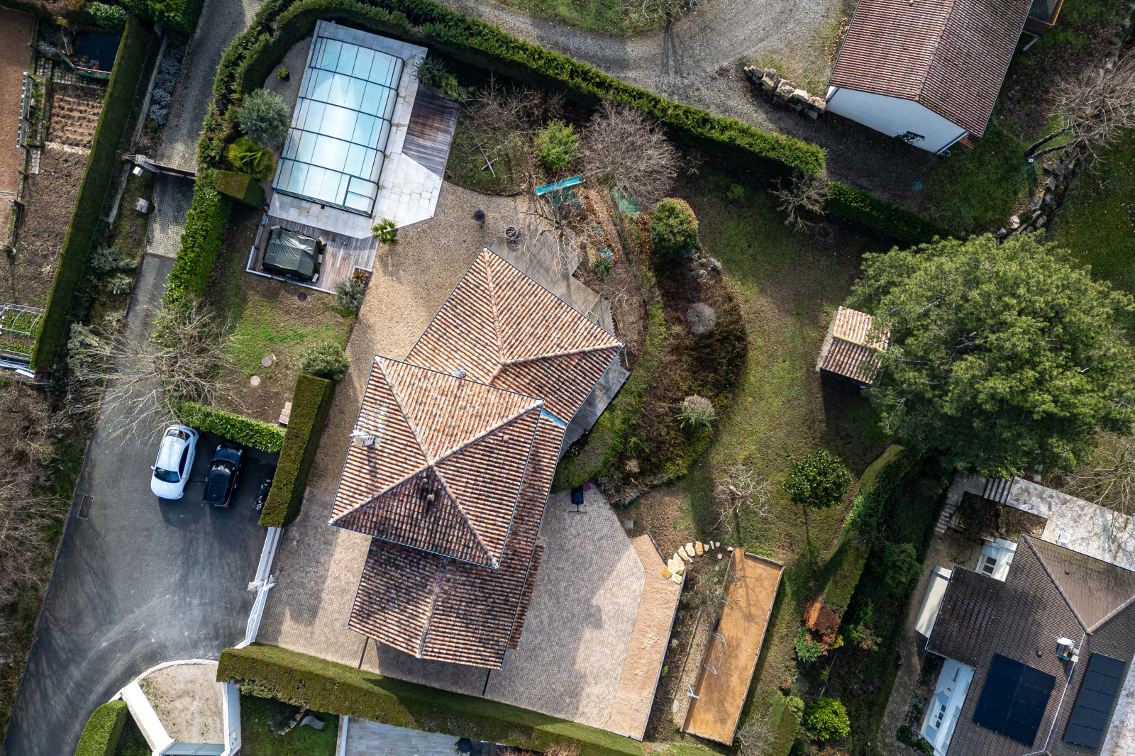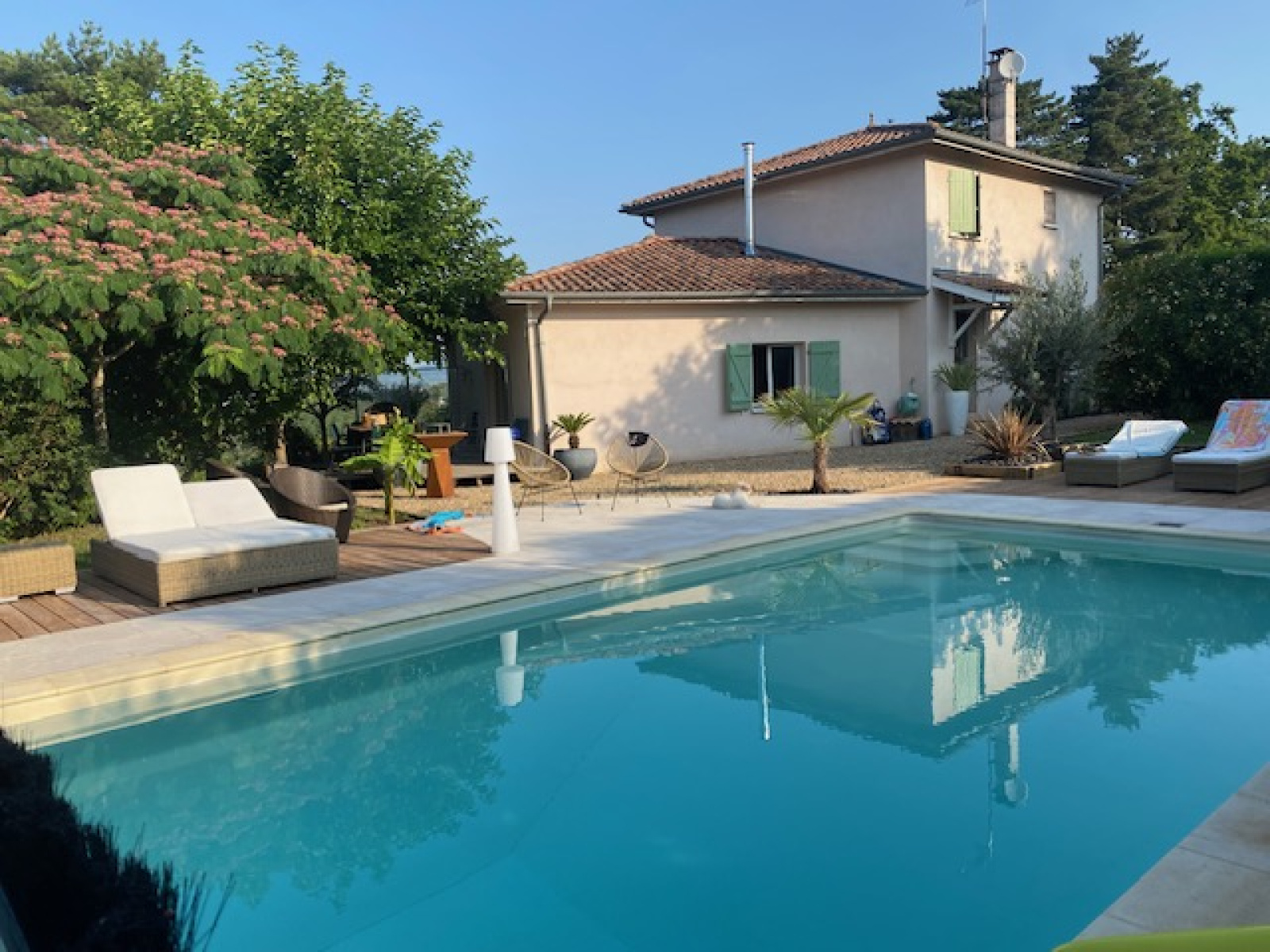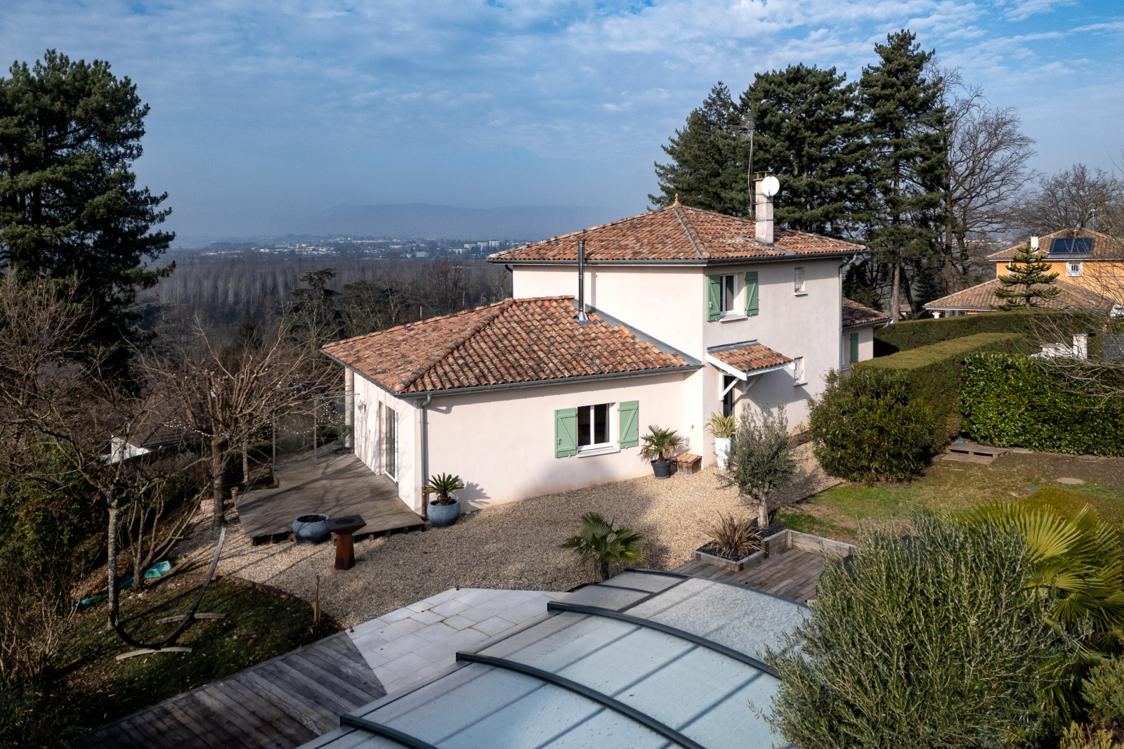 Côté jardin, un terrain de pétanque pour des moments conviviaux, une piscine à l'abri des regards pour se détendre, le tout agrémenté d'une magnifique vue panoramique sur la Saone.