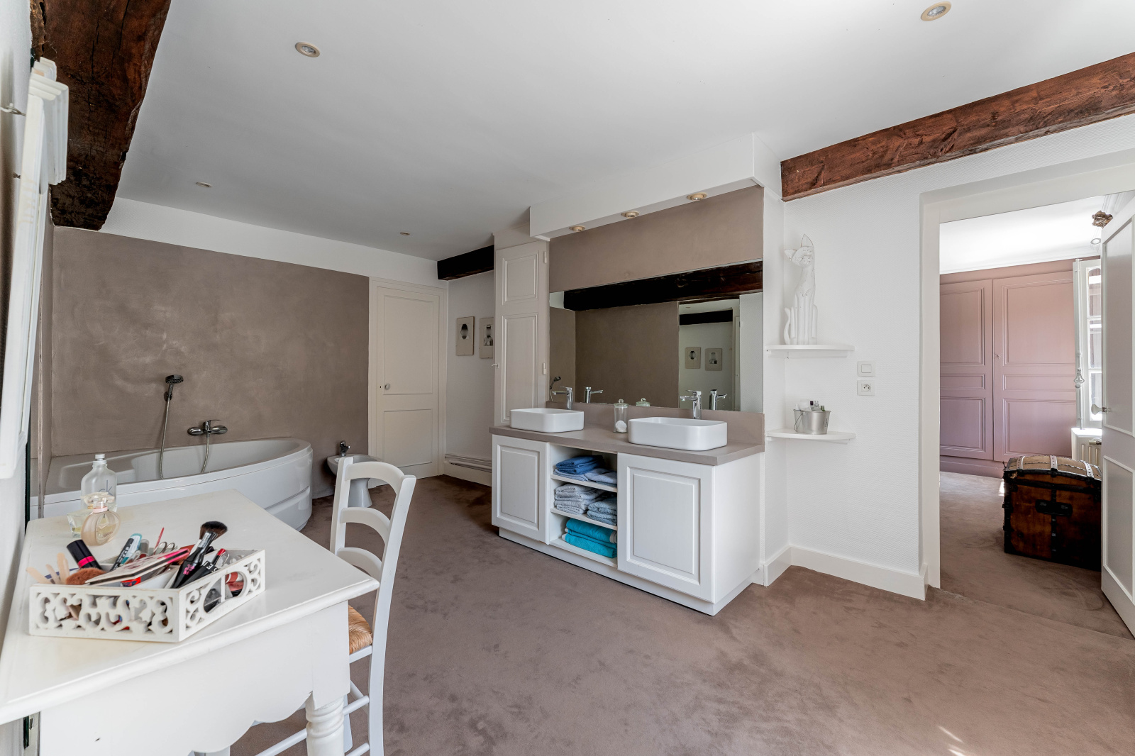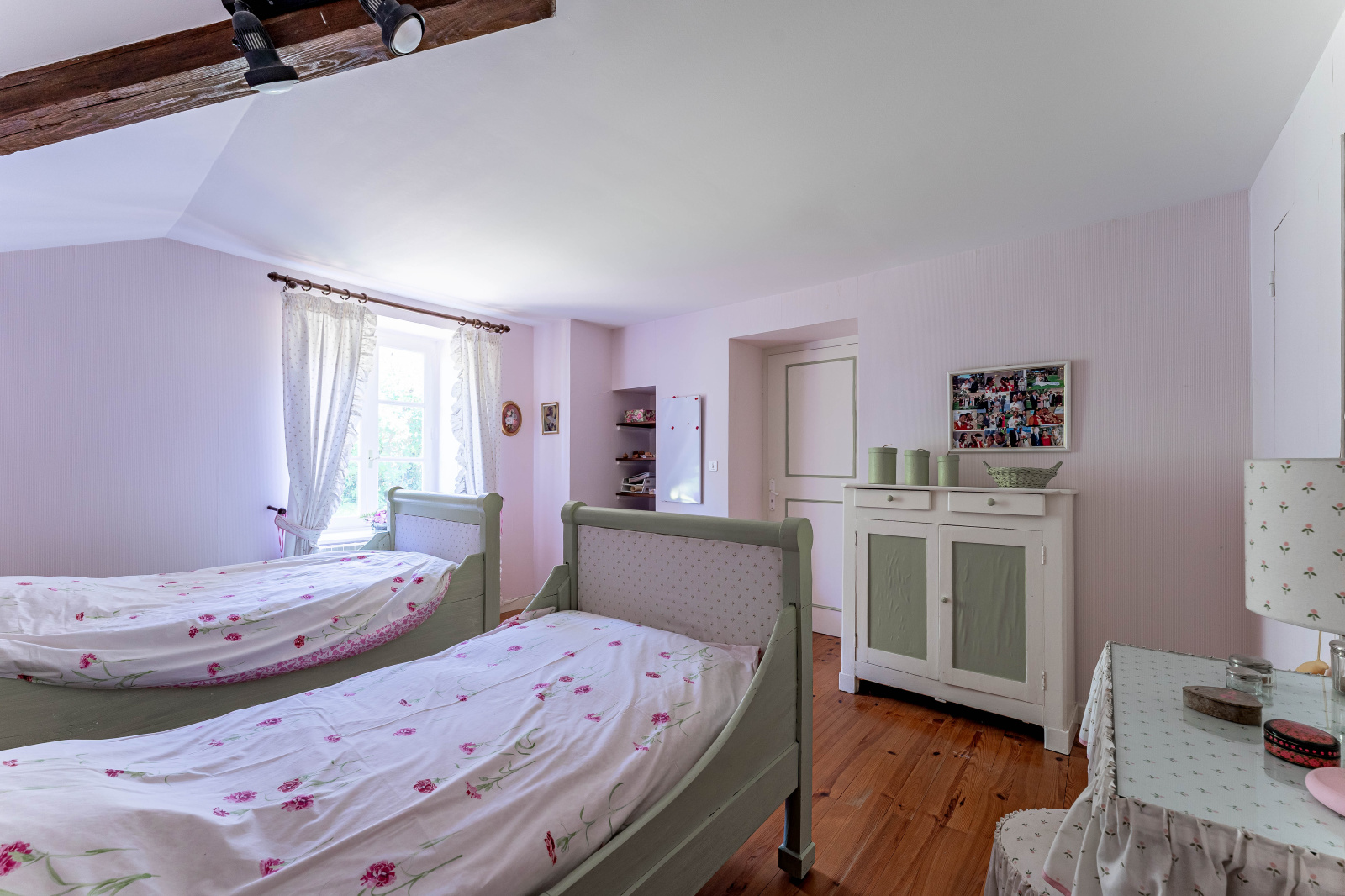 L'étage se compose de 4 chambres, une salle de bain avec wc et une salle d'eau. Pour votre confort des nombreux rangements également.