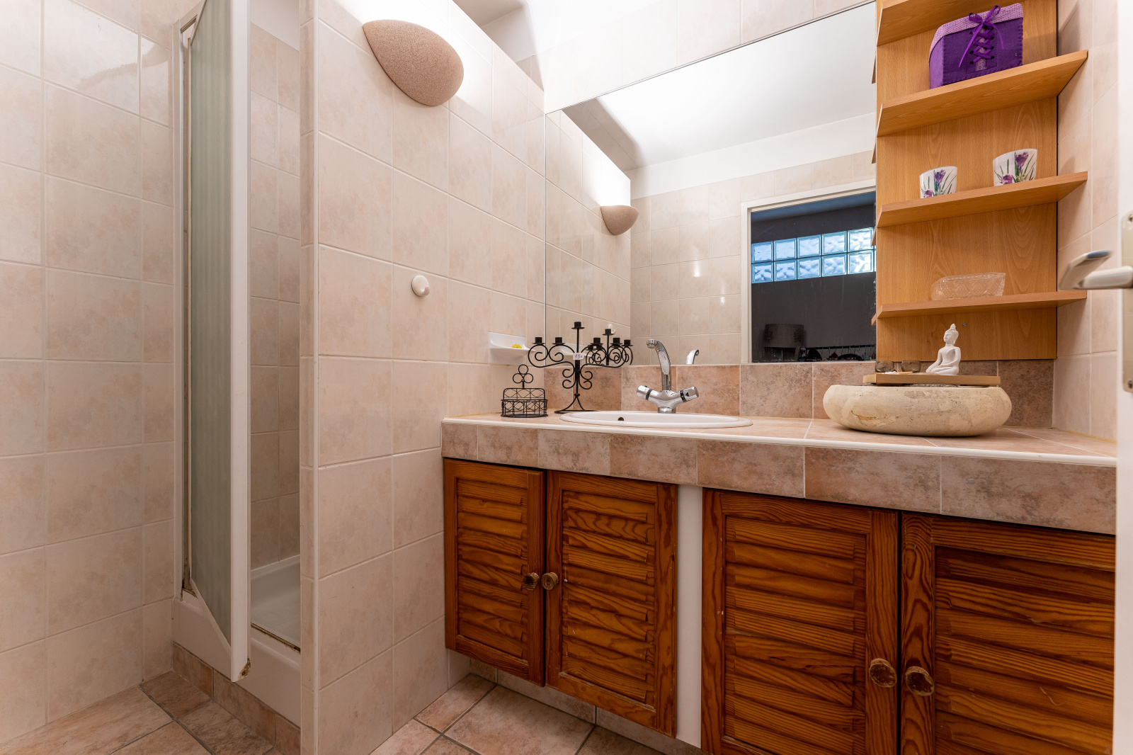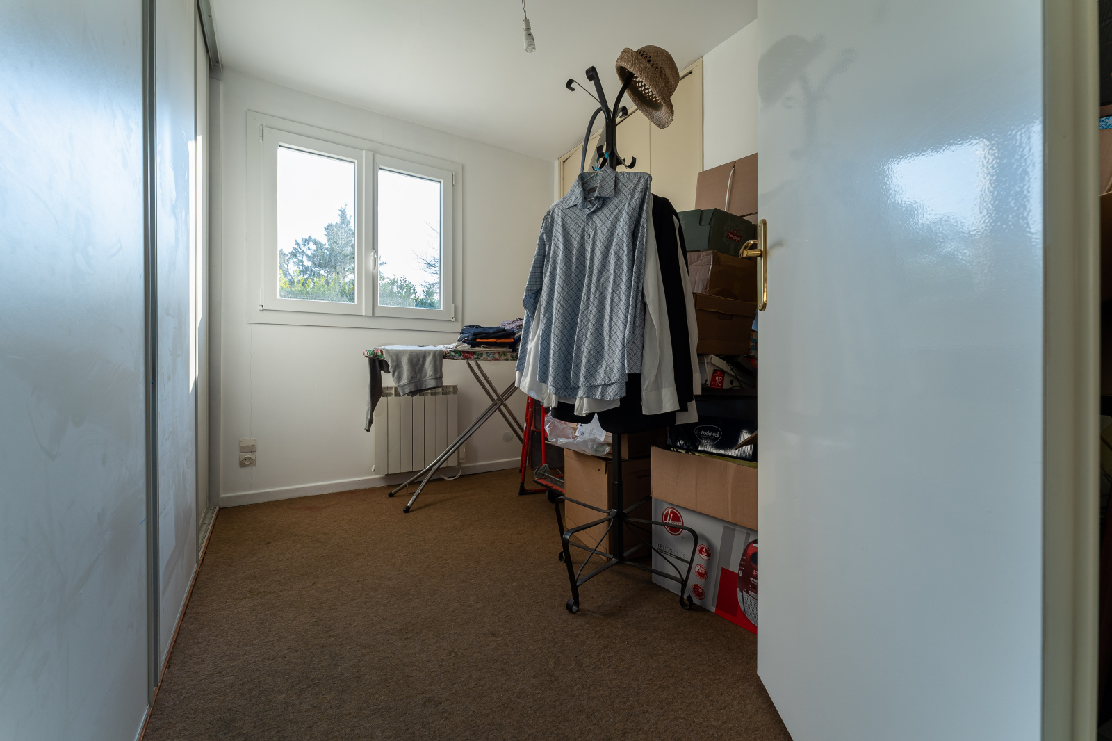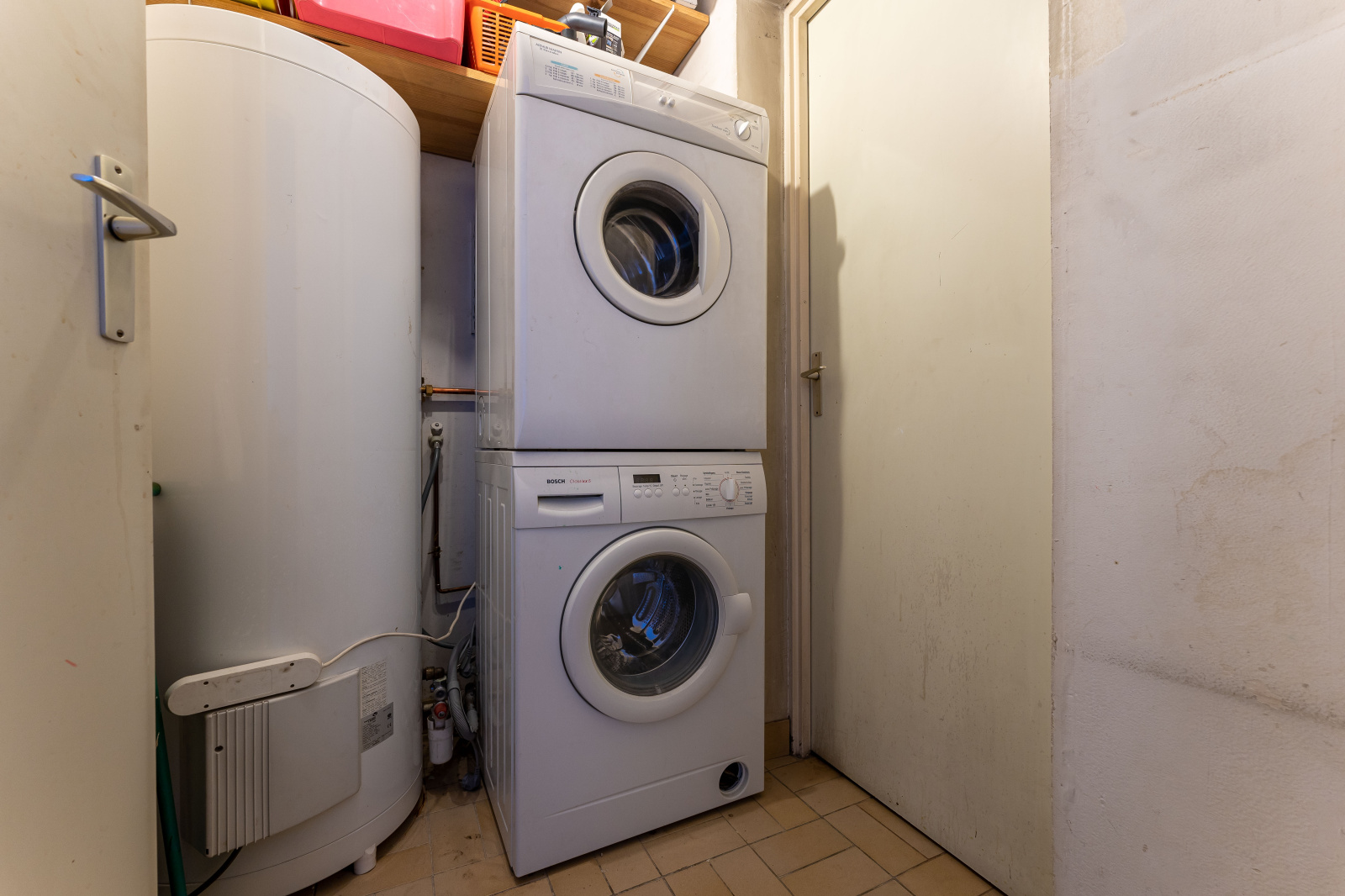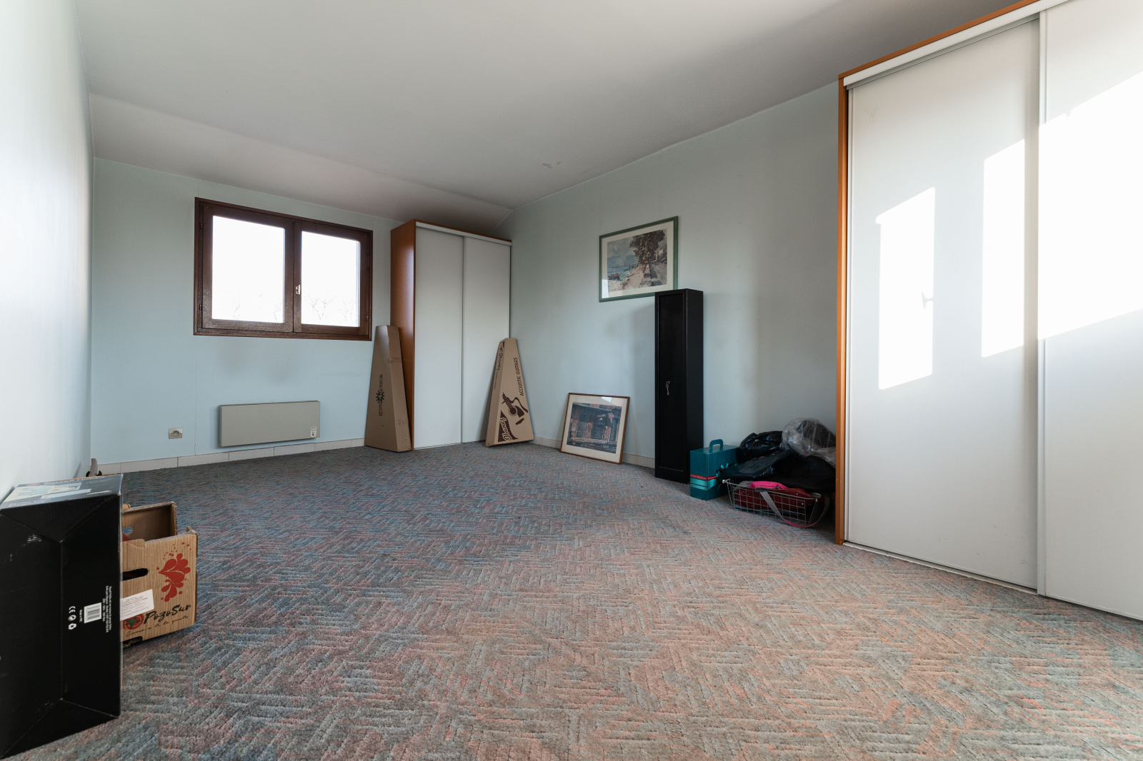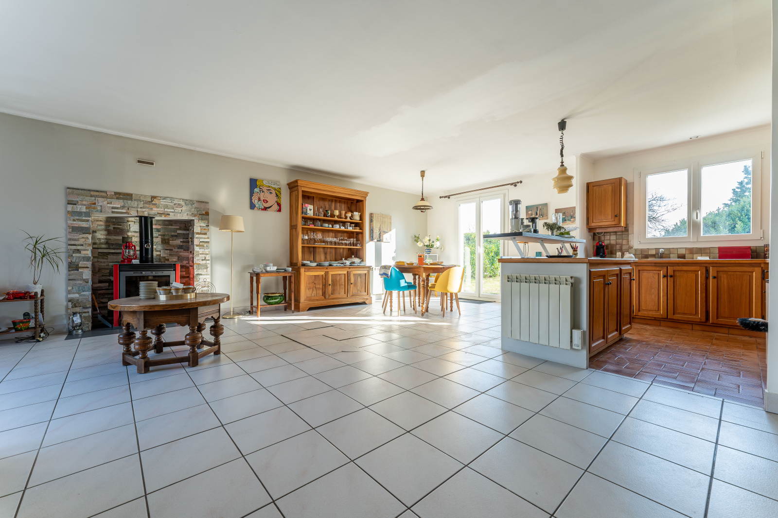 Chauffage électrique, complété par un poêle à bois dans la pièce de vie.