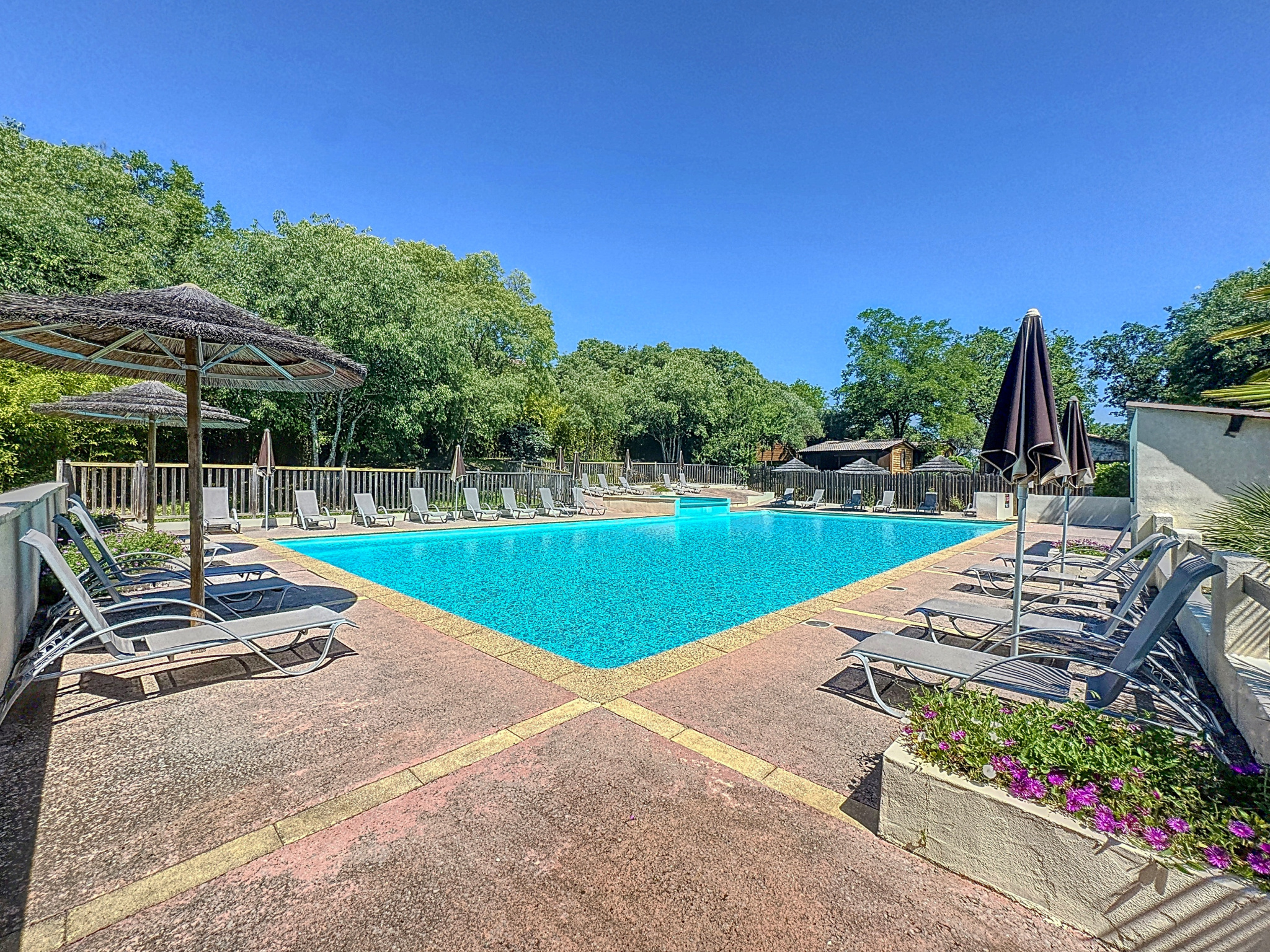 Les extérieurs du Domaine comprennent : Quatre parkings privés pour les hôtes, équipés de bornes de recharge électriques, une piscine de 20 x 10 mètres avec une vaste plage pour les bains de soleil, un terrain de volley, une aire de jeux pour enfants, et un terrain de pétanque.