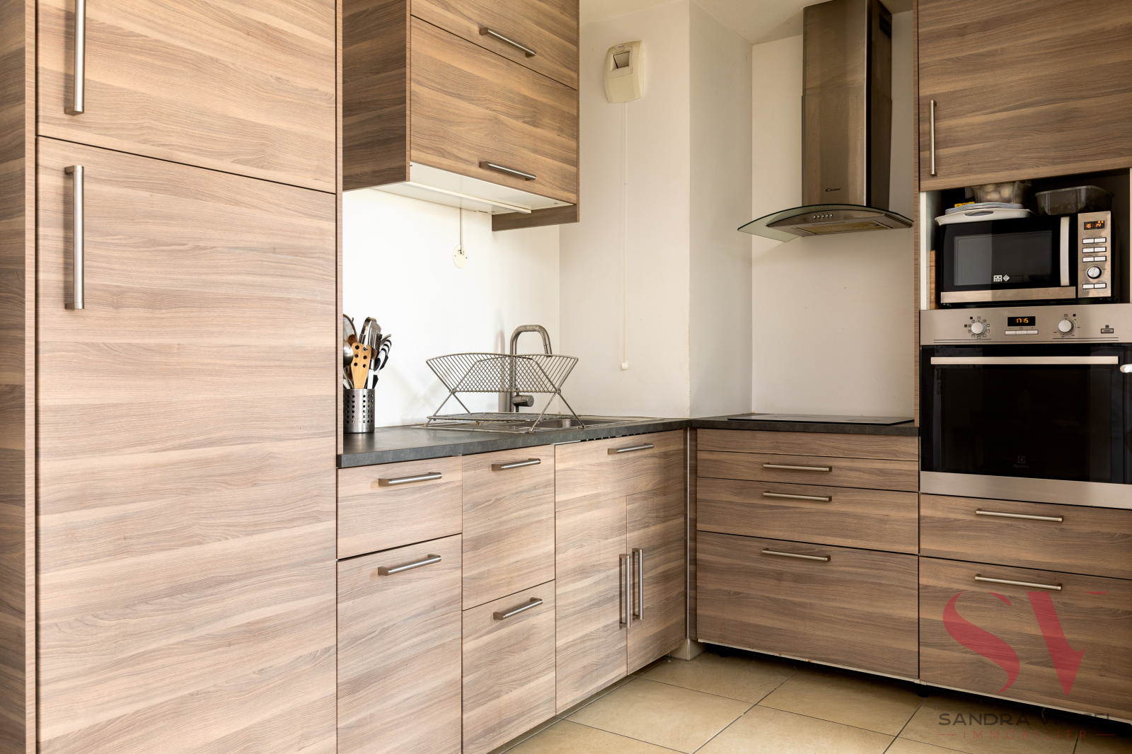 Situé au 2ème étage, l'appartement dispose d'un séjour avec cuisine ouverte de 25,1 m2, de 2 chambres (9,2 et 12 m2), une salle de bain et d'un WC séparé.