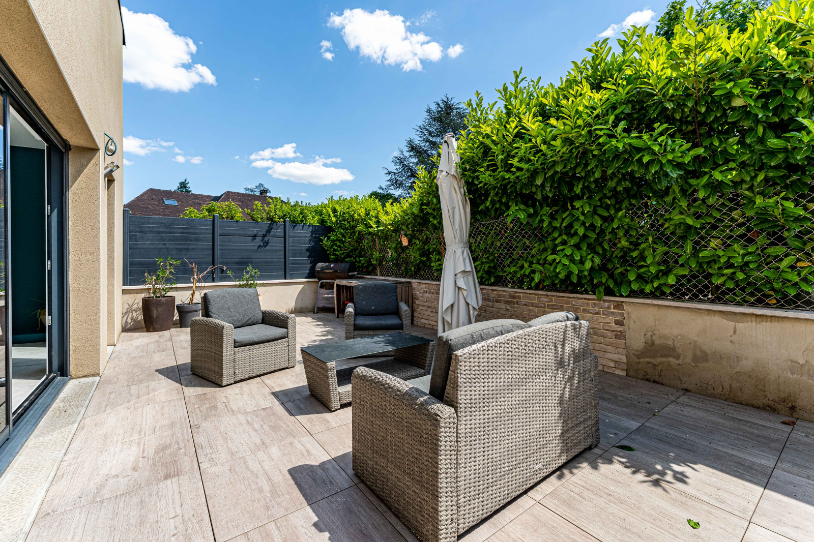 Cet espace s’ouvre sur une terrasse plein sud, intime et baignée de soleil, parfaite pour profiter des beaux jours en toute tranquillité.