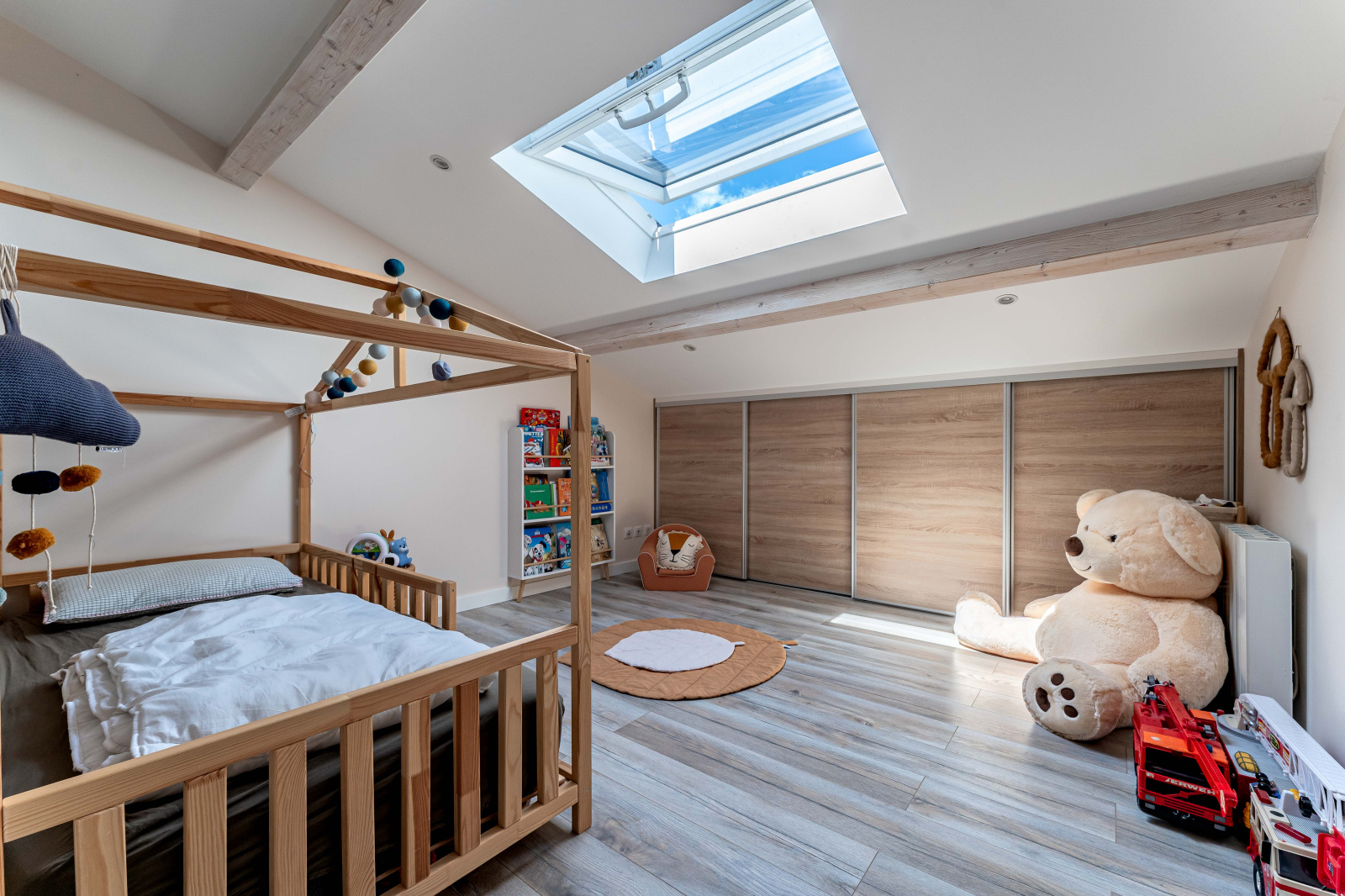 À l’étage, une mezzanine modulable vous offre la liberté d’imaginer votre espace : bureau inspirant, salle de jeux ou chambre supplémentaire. Trois chambres mansardées au charme unique et une grande salle de bain complètent ce niveau, alliant confort et fonctionnalité.