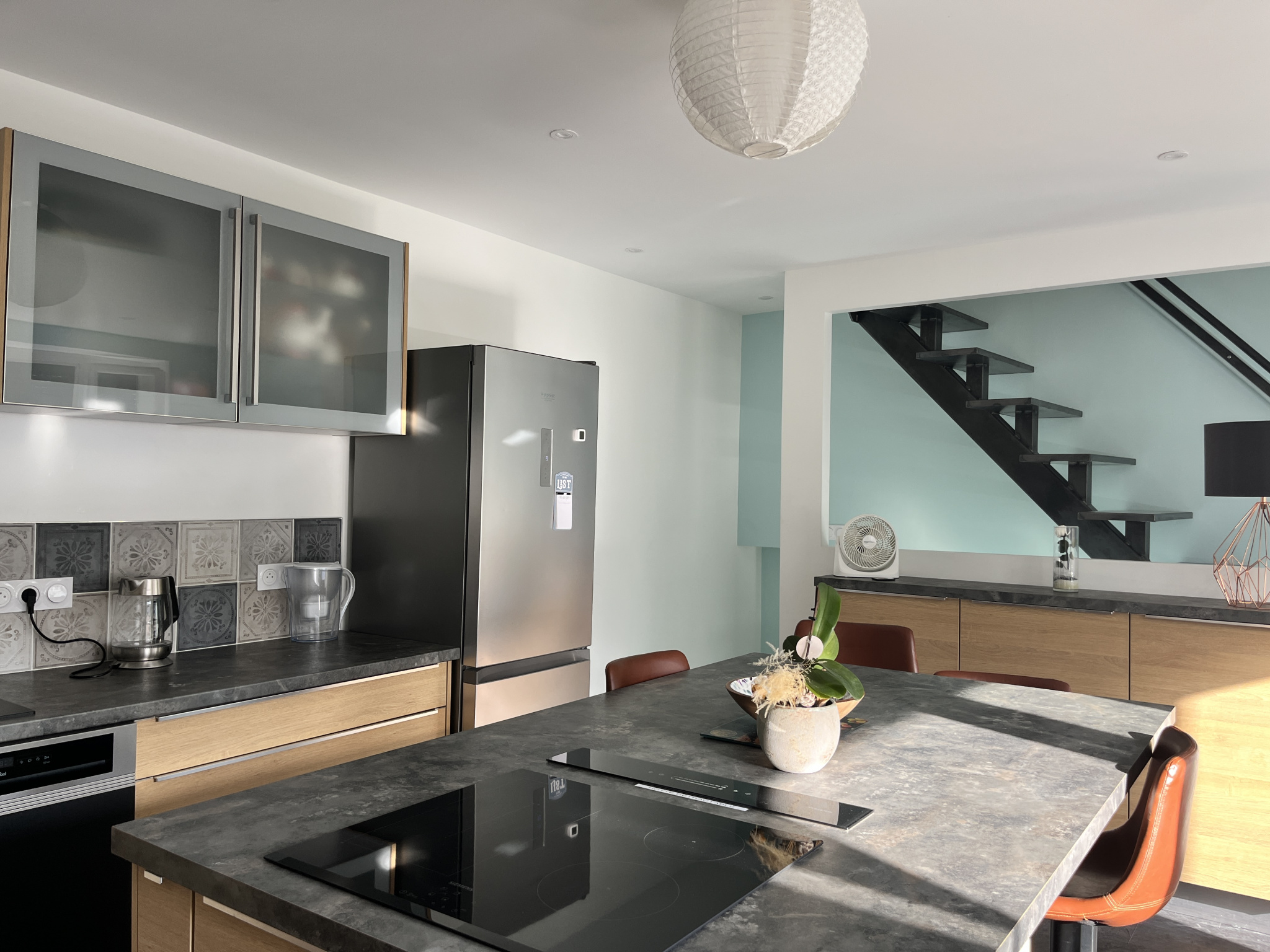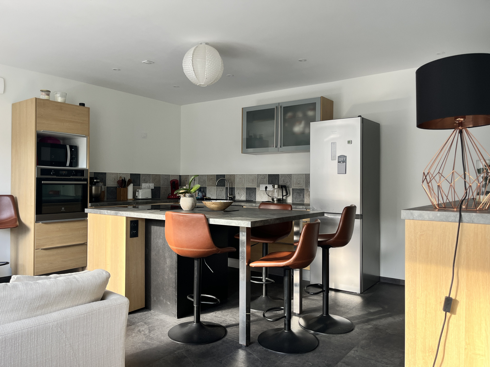 - Au premier étage, un bel espace de vie lumineux comprenant un séjour chaleureux avec sa cuisine moderne aménagée et entièrement équipée
