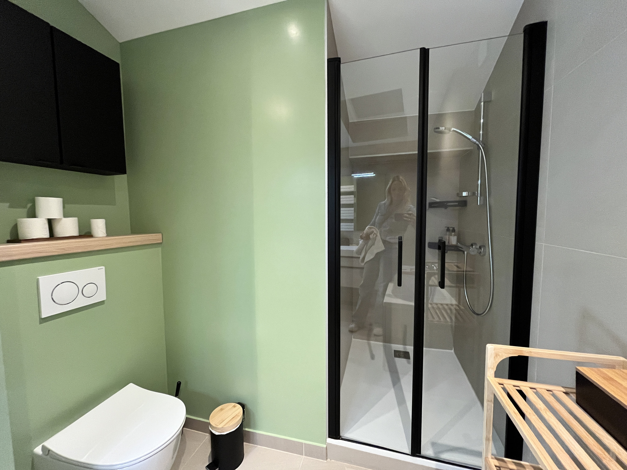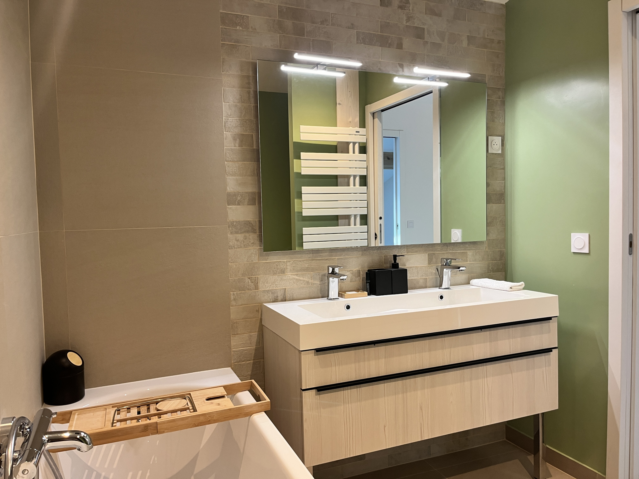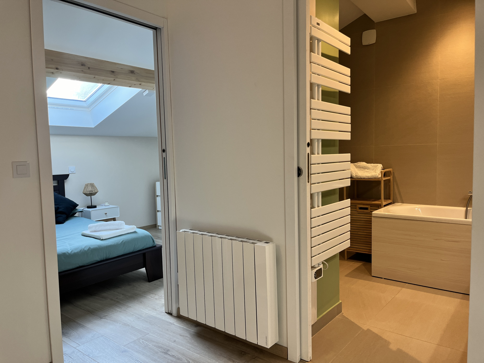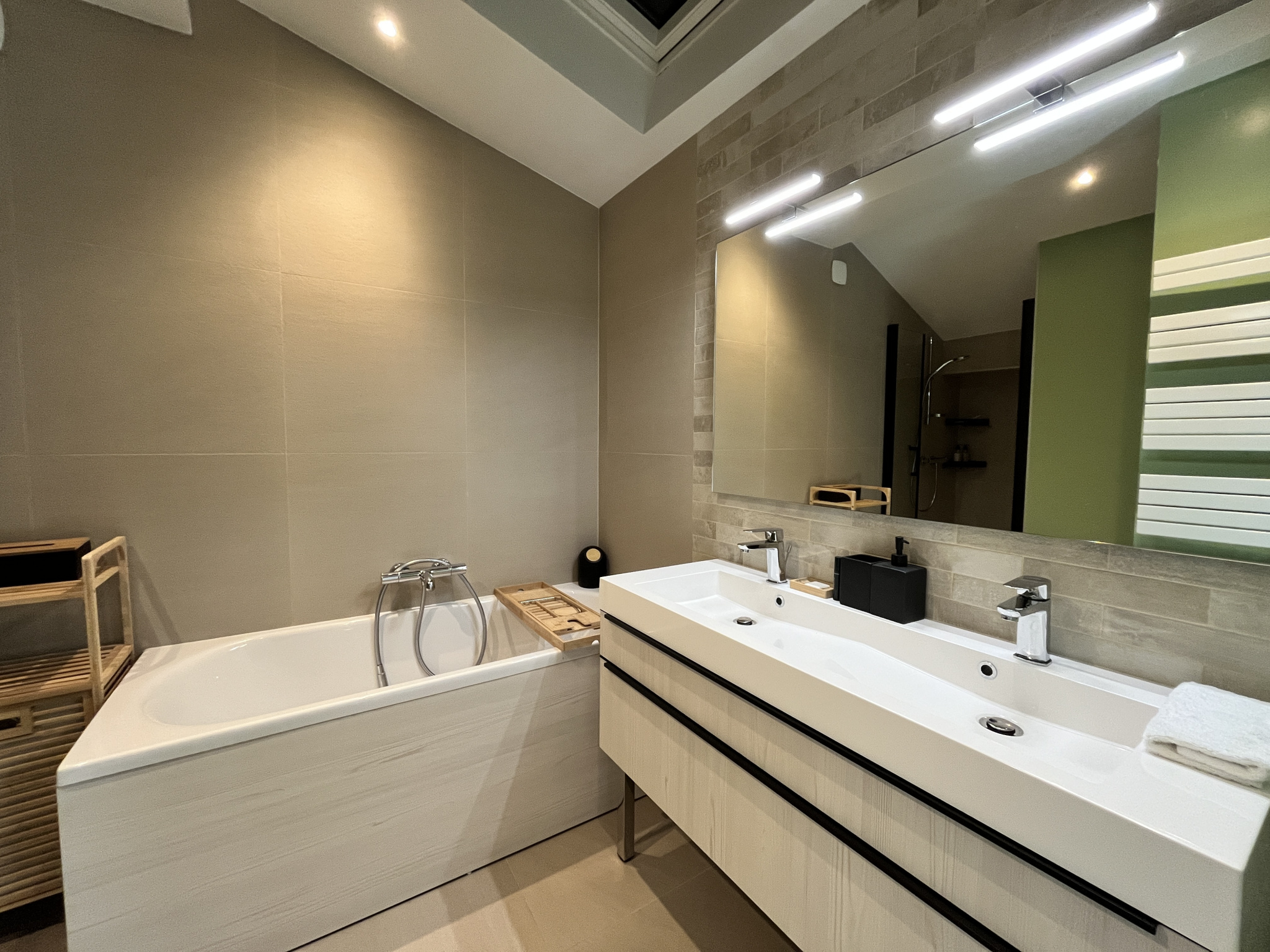 - Au dernier niveau, une chambre et sa salle de bain élégante et parfaitement équipée.