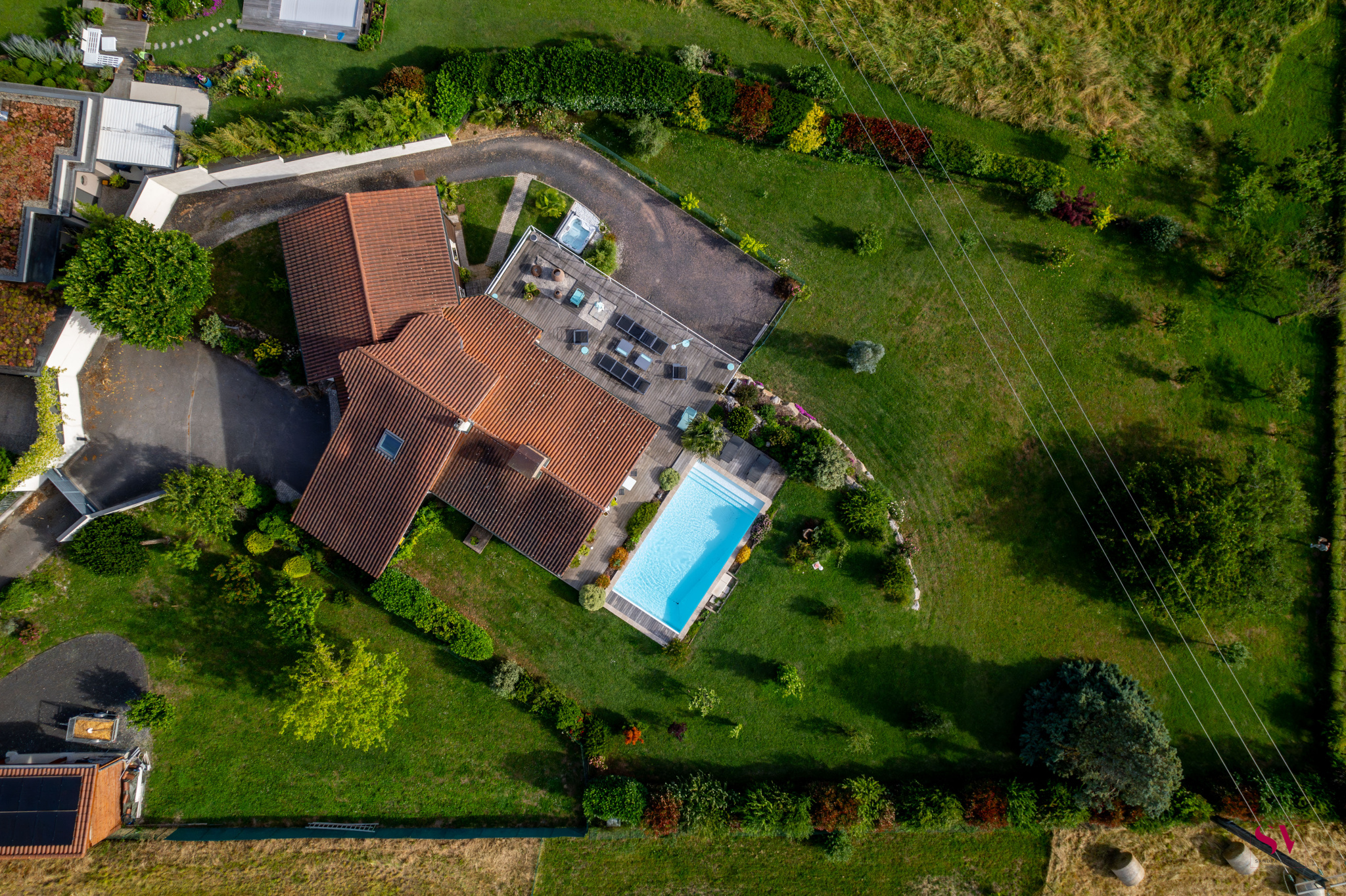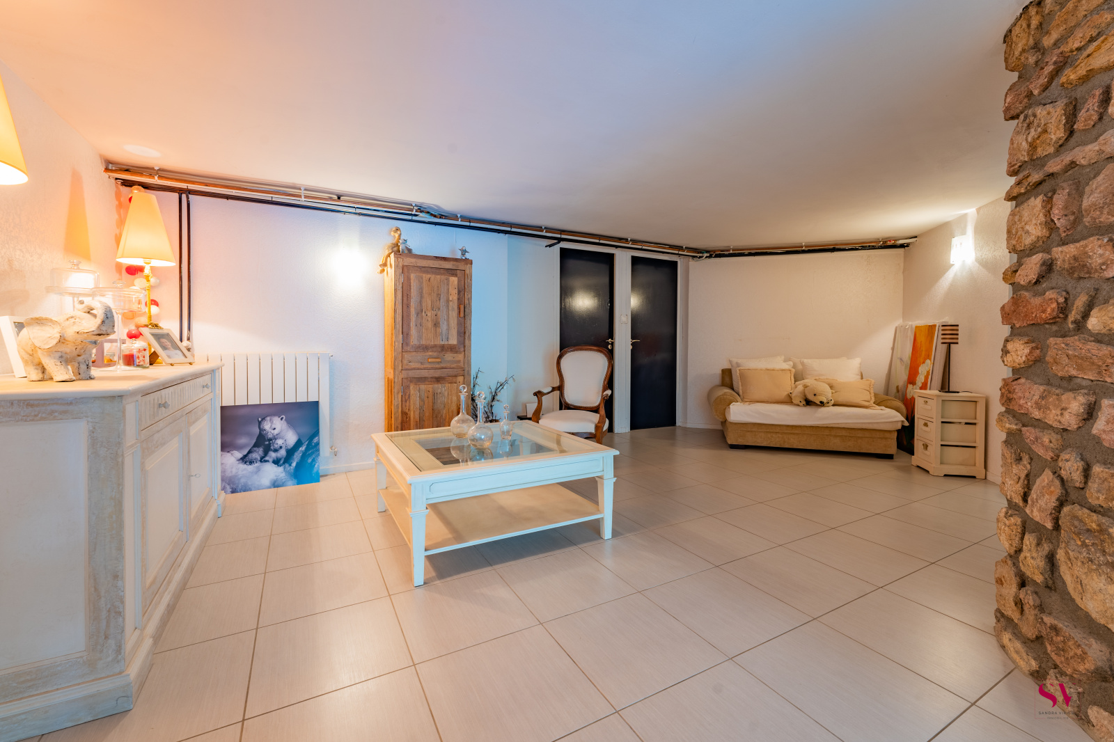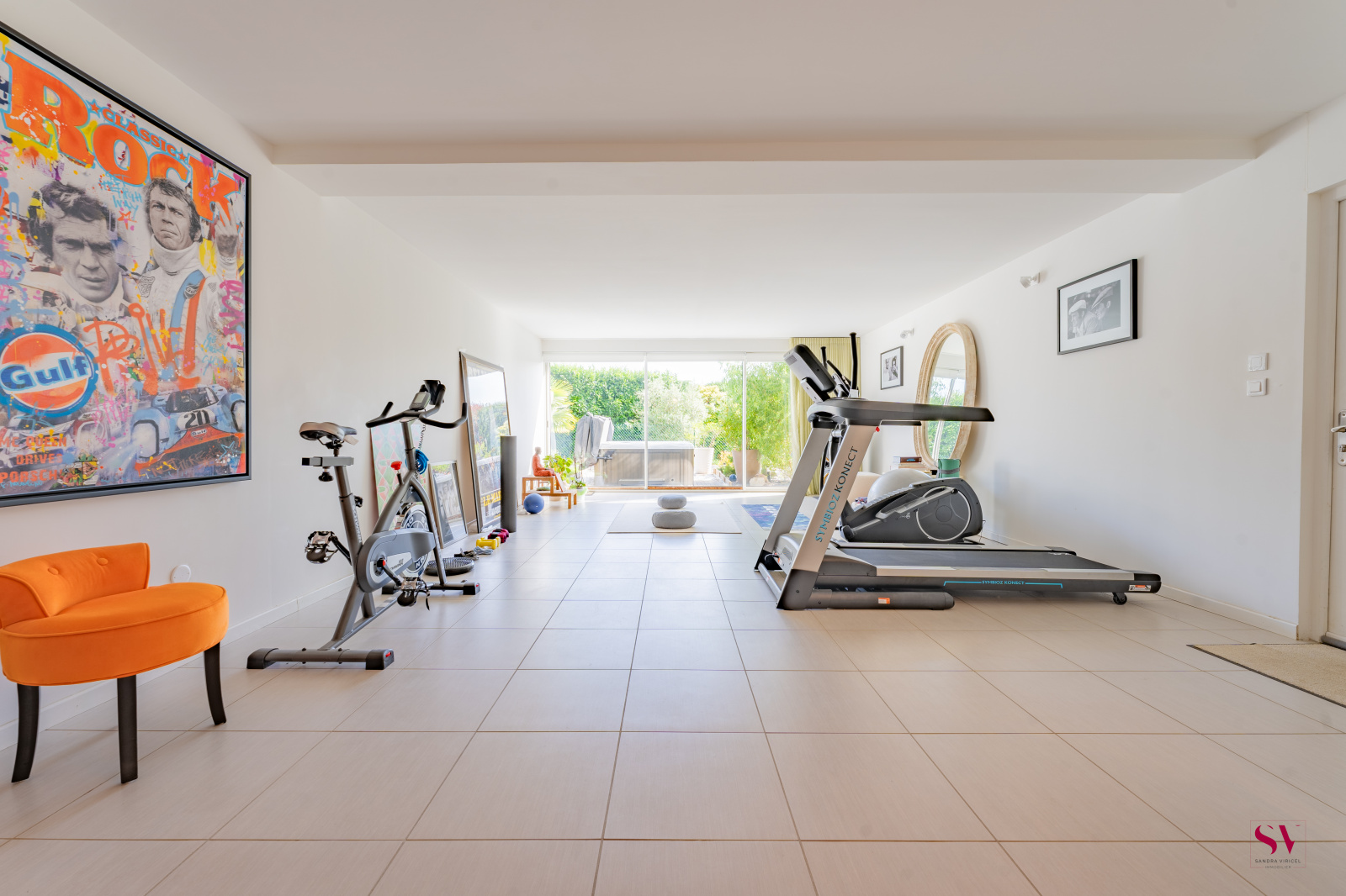 Au niveau inférieur, vous découvrirez deux chambres, 2 salles d'eau, une cave à vin, un bureau, une salle de sport de 25m², un atelier et un grand garage de 60m² pour 3 véhicules.