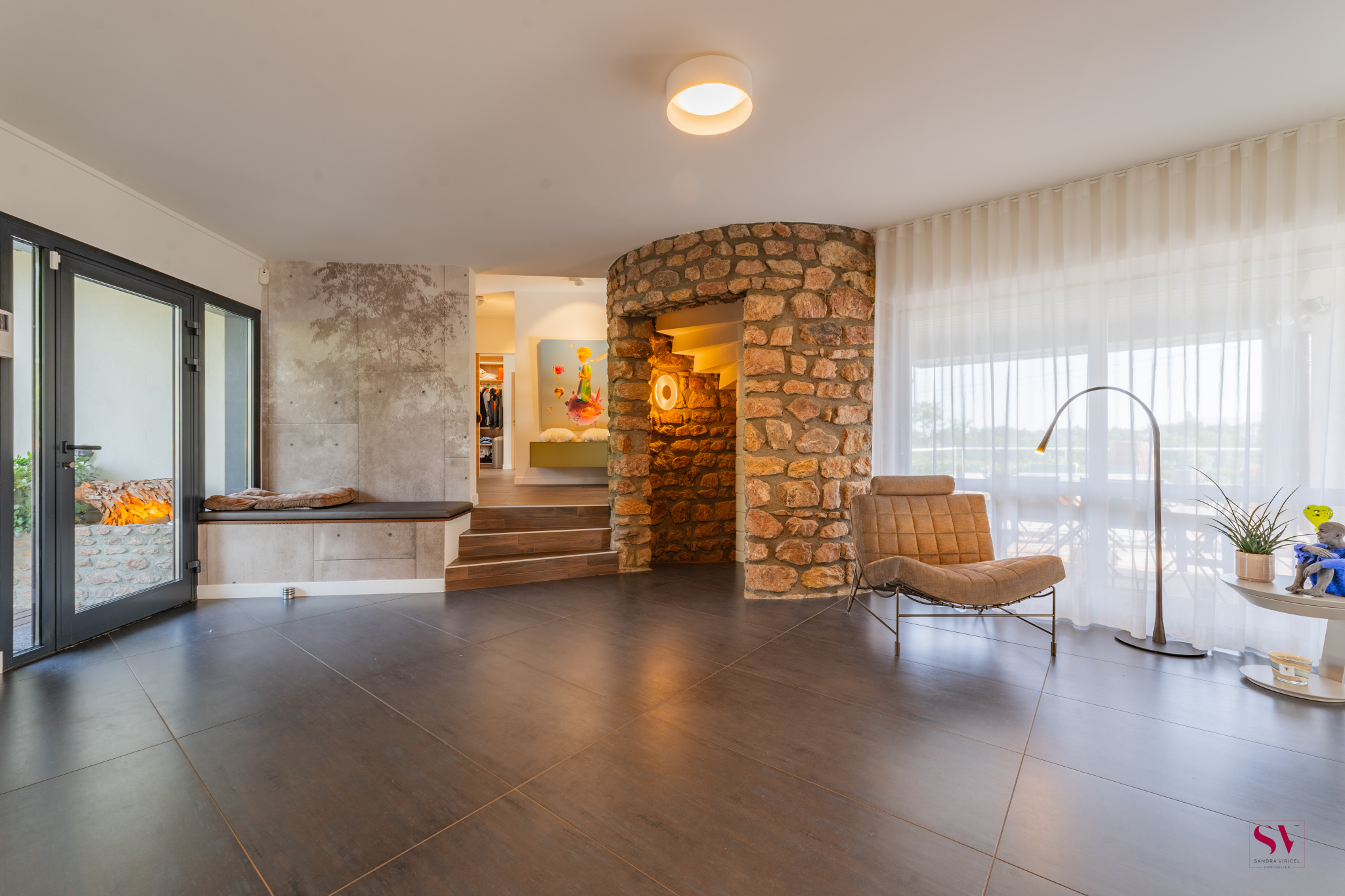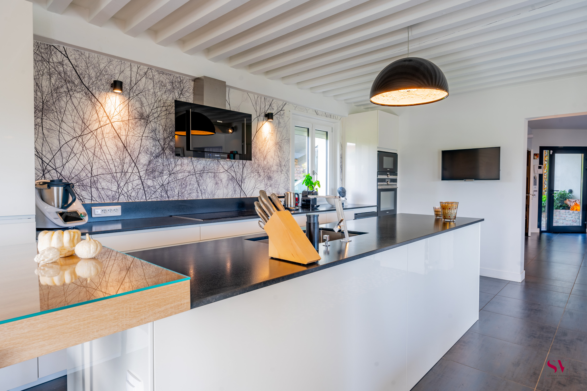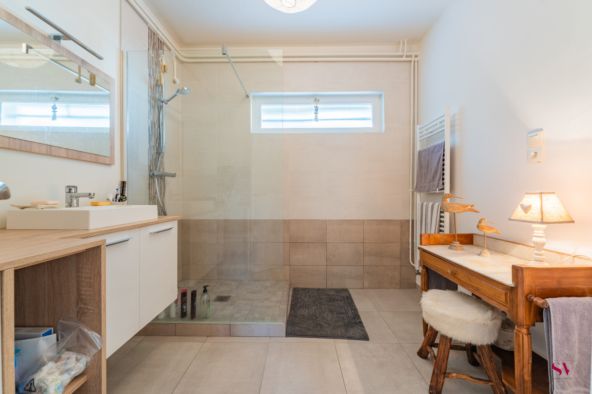 Au niveau inférieur, vous découvrirez deux chambres, 2 salles d'eau, une cave à vin, un bureau, une salle de sport de 25m², un atelier et un grand garage de 60m² pour 3 véhicules.