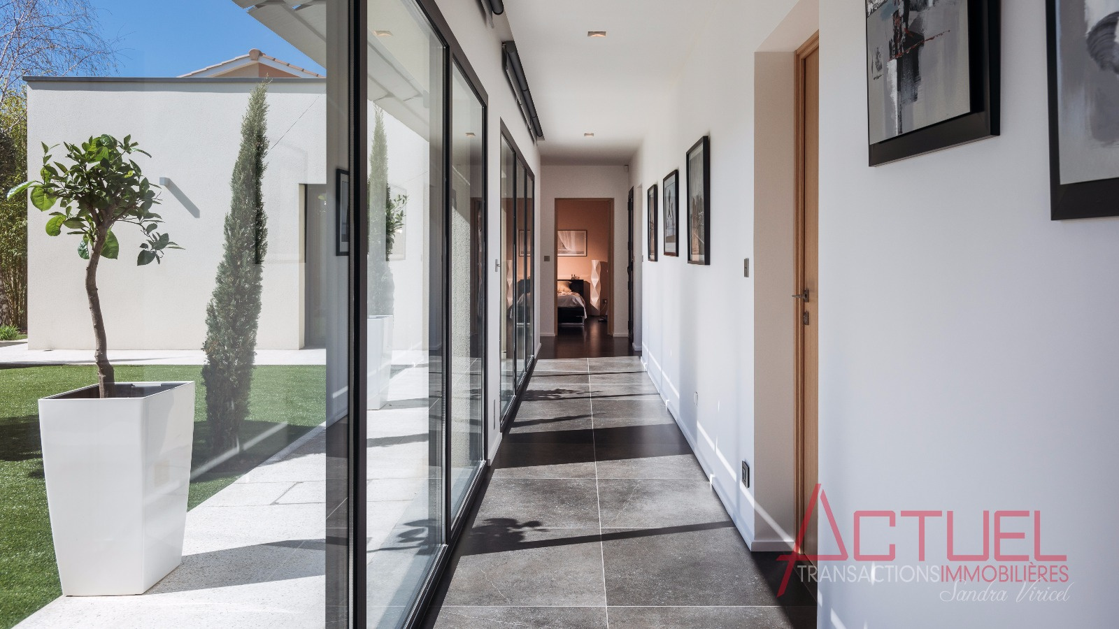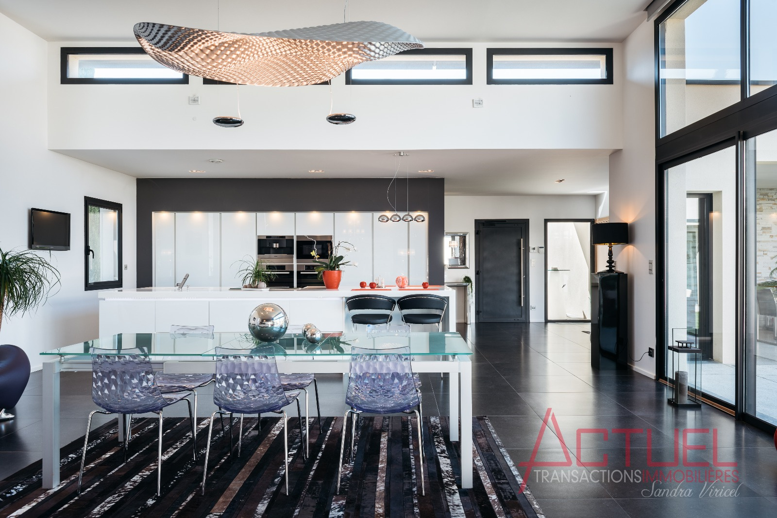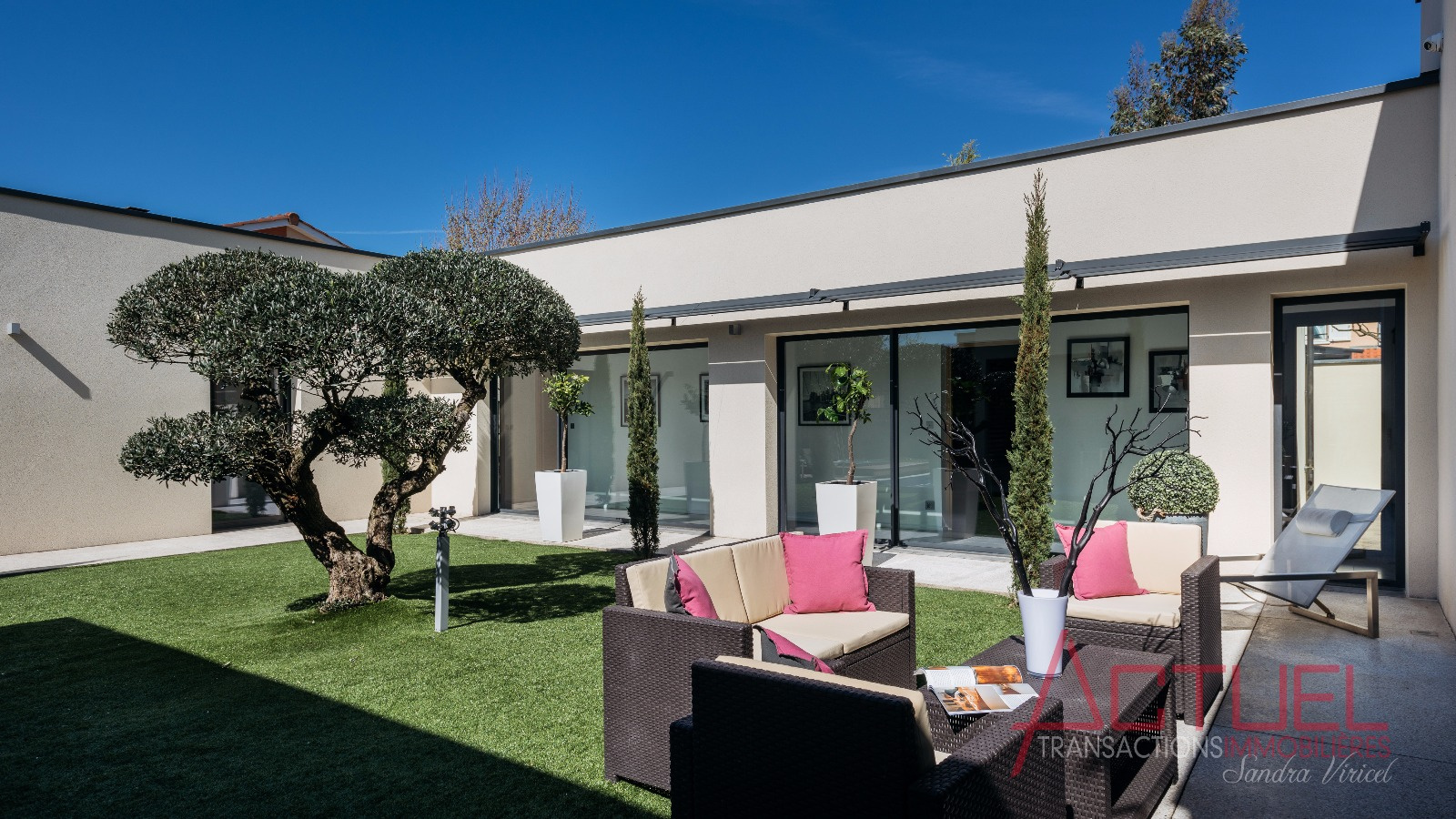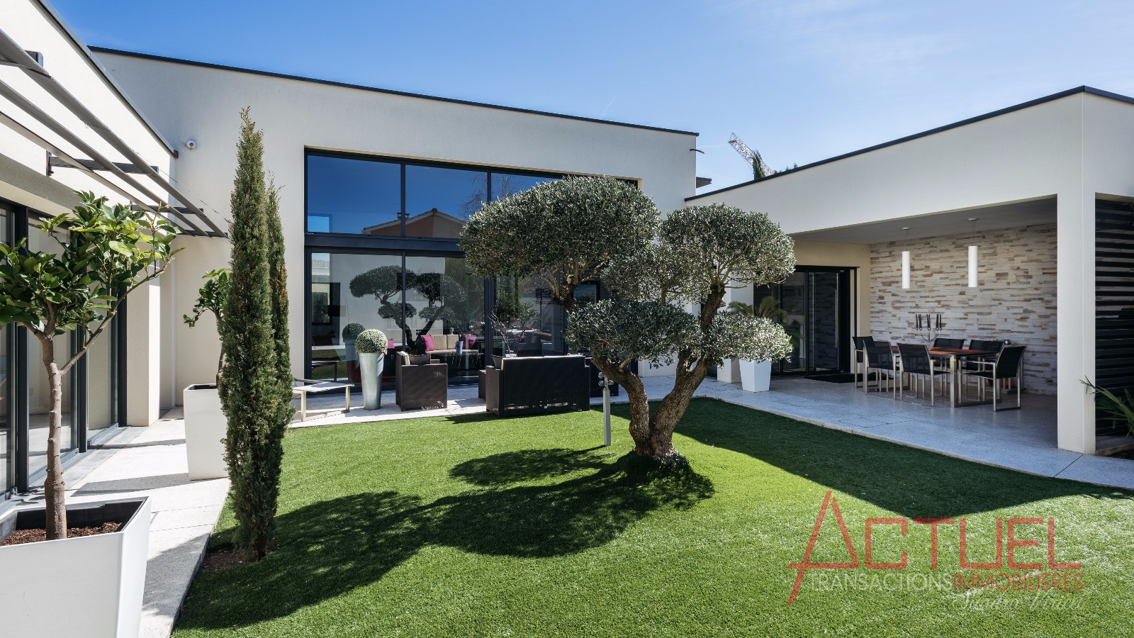 Orientée autour d'un patio, sans vis à vis, et baignée de lumière, la maison entièrement de plain-pied se compose d'une superbe pièce de vie de 90 m2 avec une cuisine haut de gamme et cellier, 4 mètres de hauteur sous plafond.Uune coursive distribue les 2 chambres, la suite parentale, une salle de bain et un bureau.