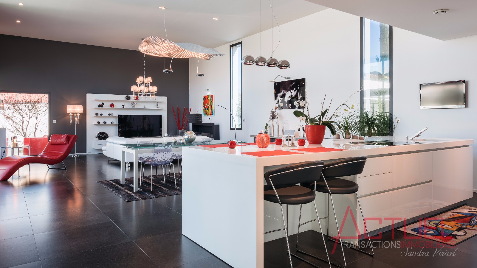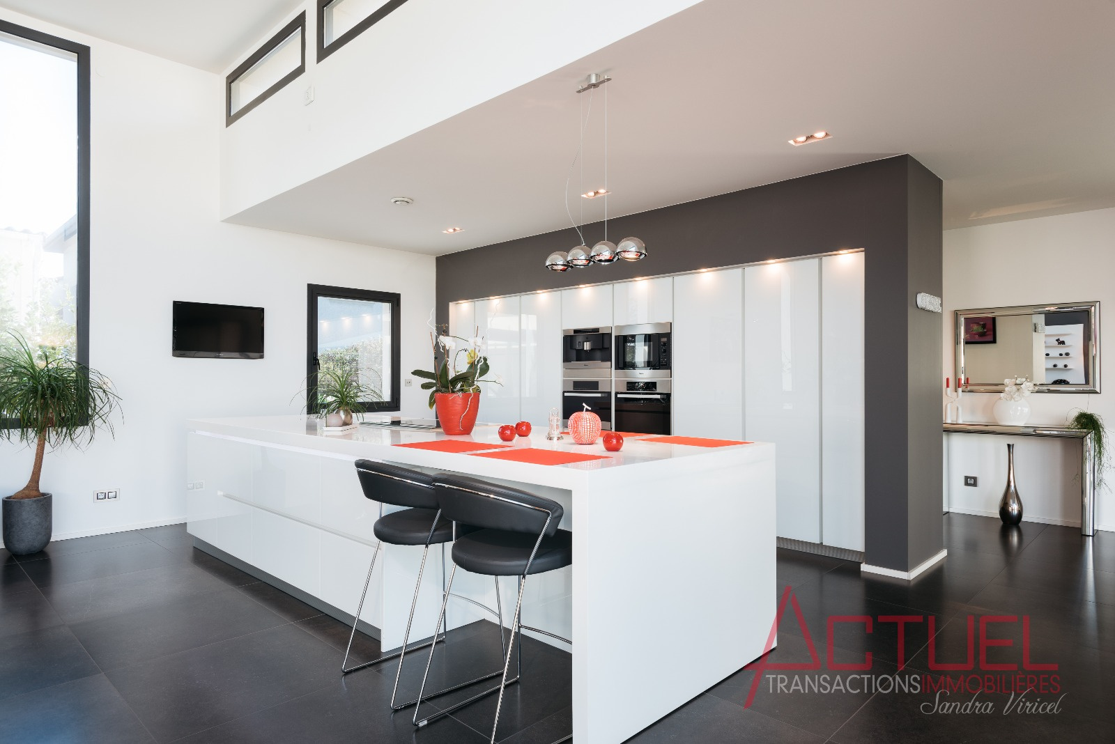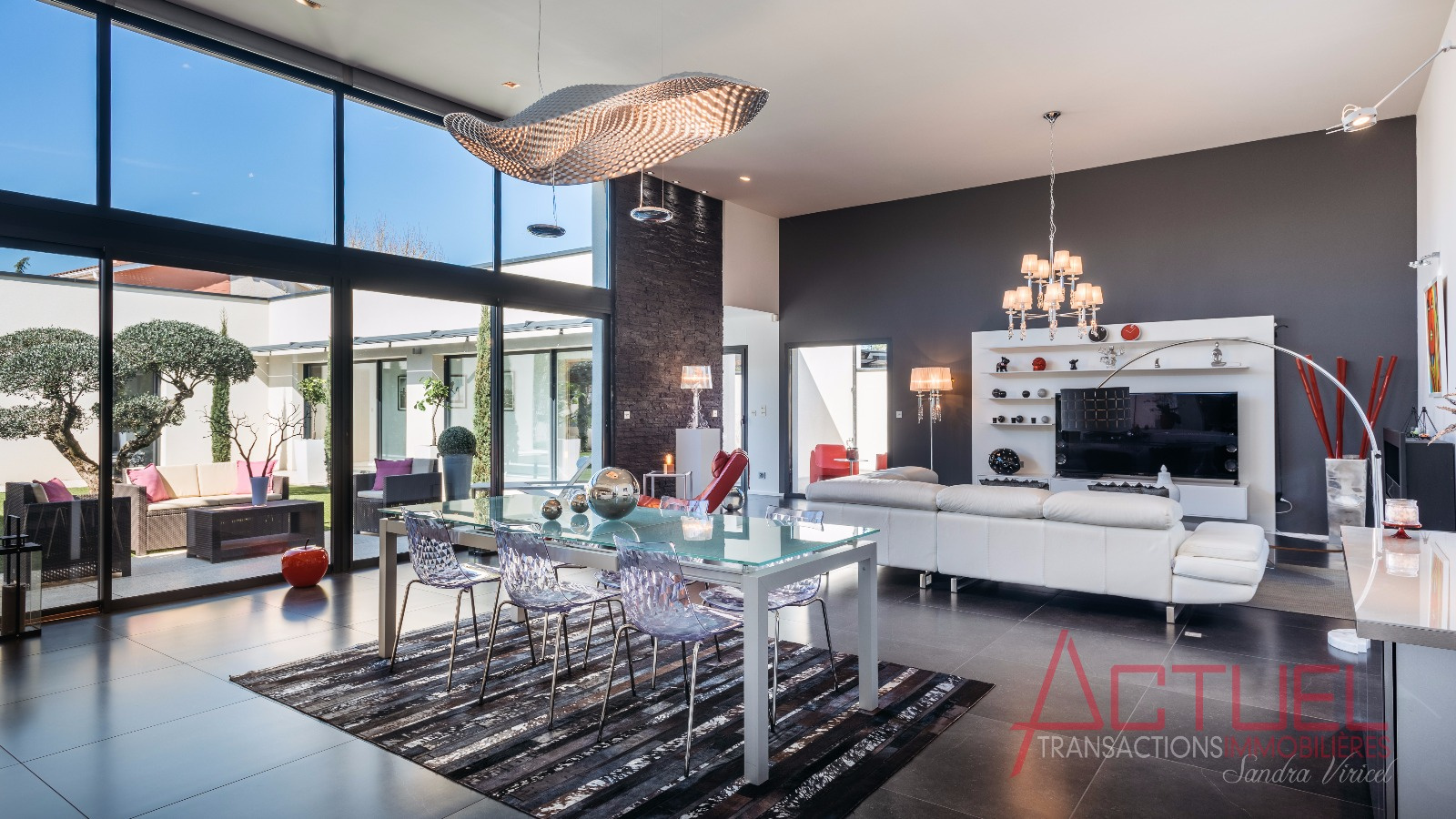 Orientée autour d'un patio, sans vis à vis, et baignée de lumière, la maison entièrement de plain-pied se compose d'une superbe pièce de vie de 90 m2 avec une cuisine haut de gamme et cellier, 4 mètres de hauteur sous plafond.Uune coursive distribue les 2 chambres, la suite parentale, une salle de bain et un bureau.