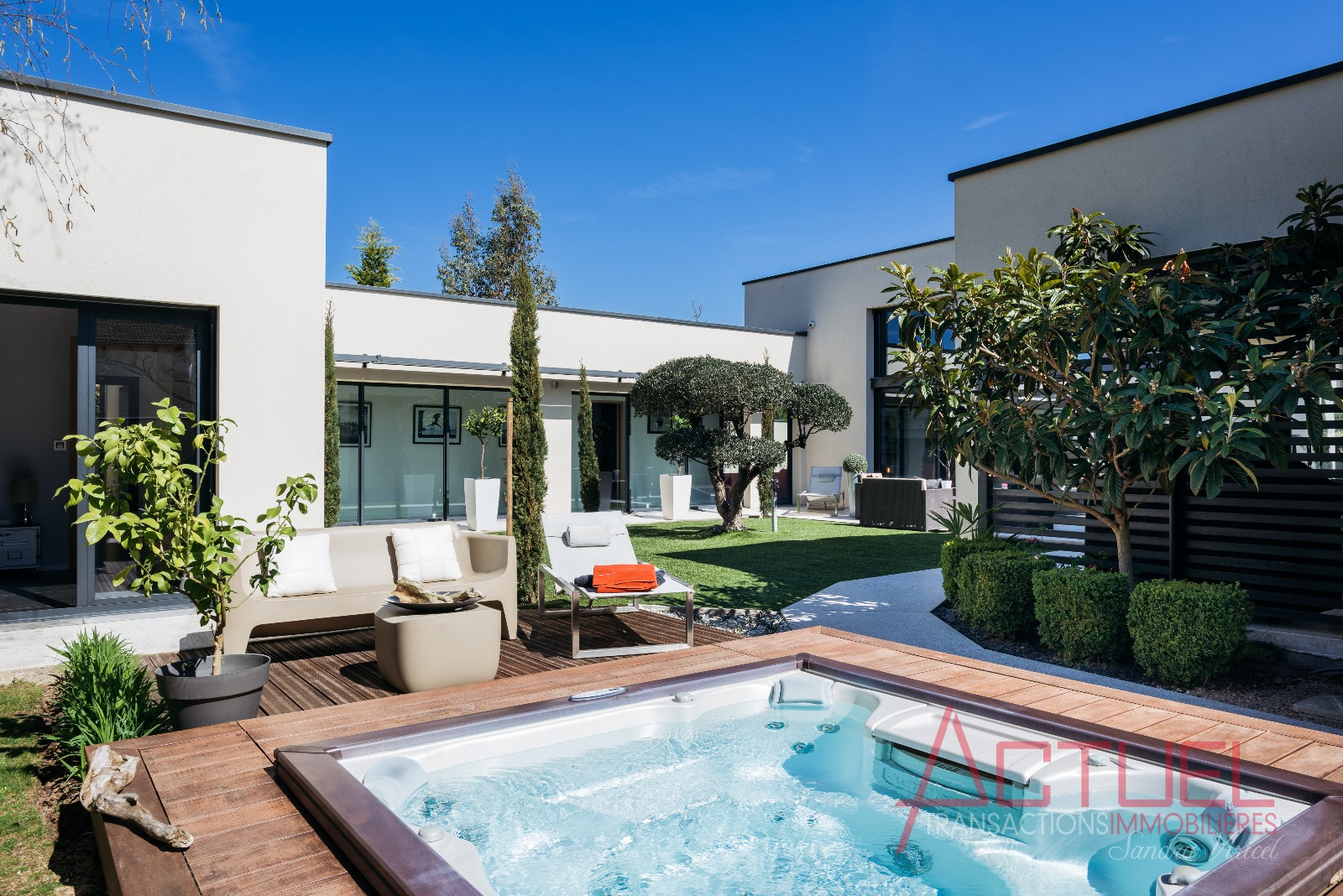 Terrasse couverte, jacuzzi et 3 autres patios paysagés et 65 m2 d'annexes dont un garage double complètent ce bien.