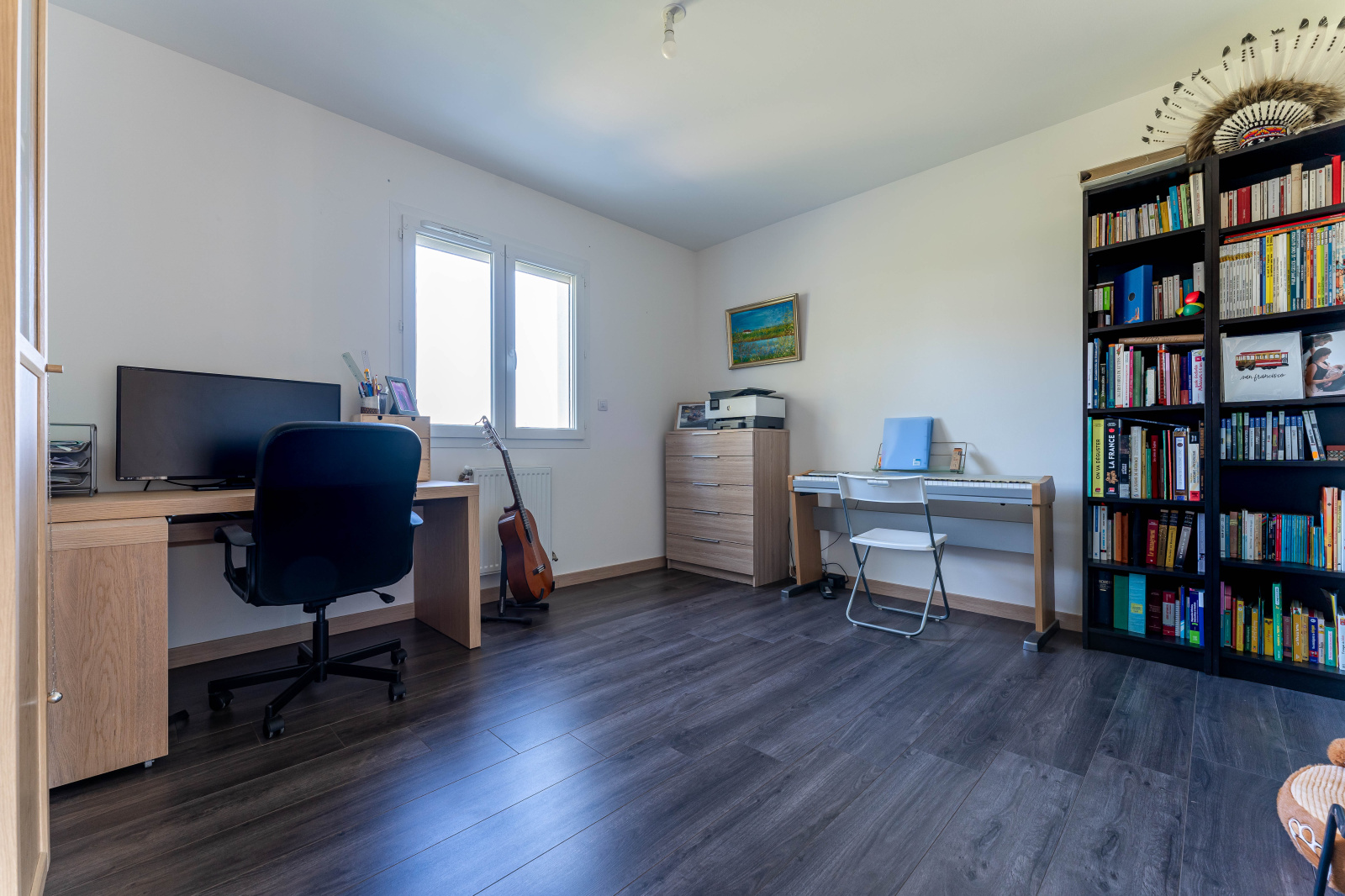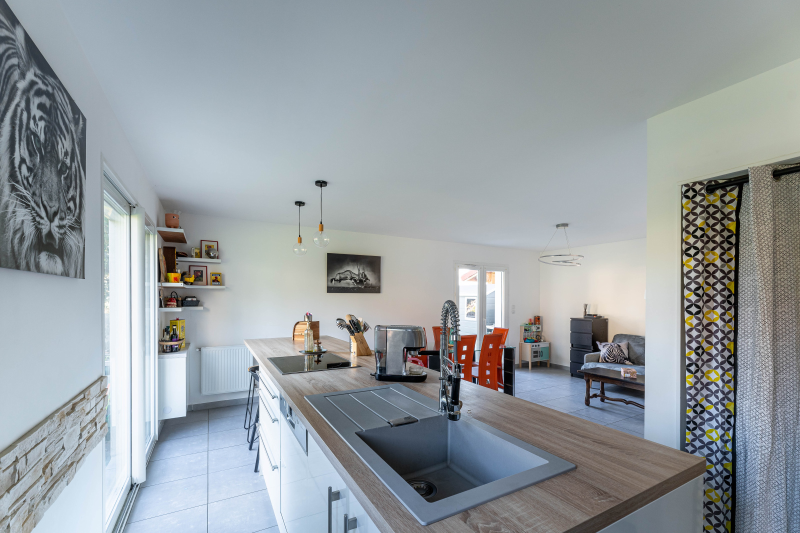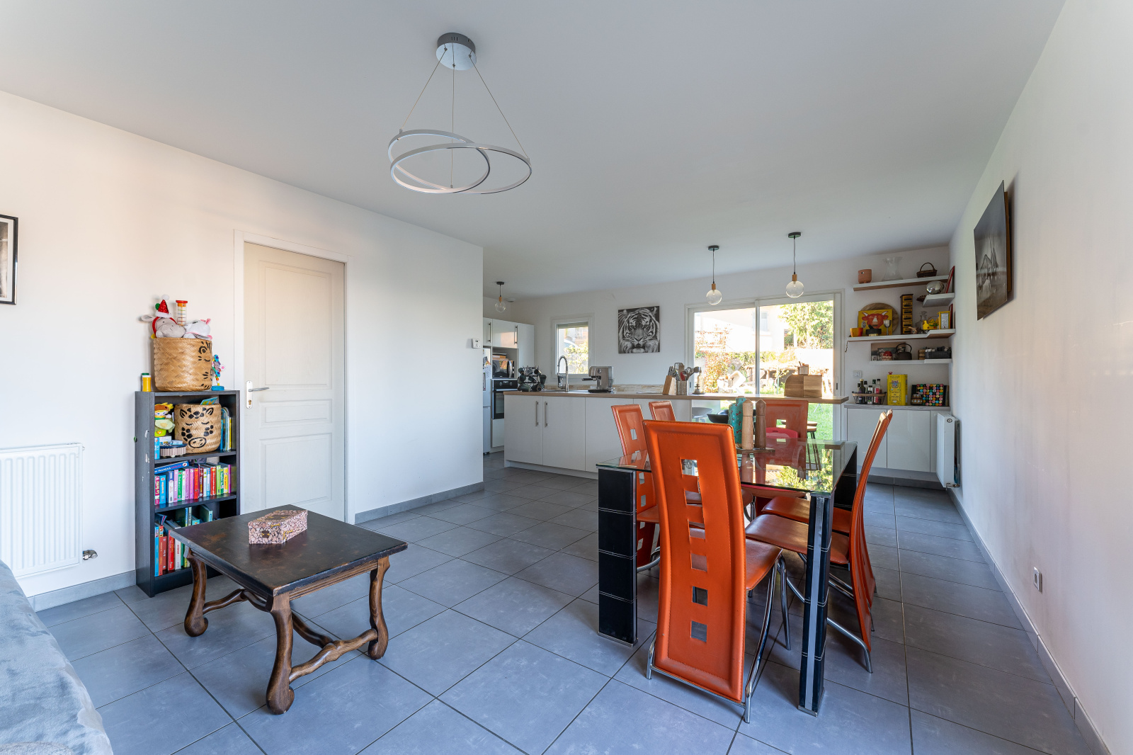 Elle se compose au rez-de-chaussée d'une entrée avec placard mural, un bel espace de vie salon-séjour lumineux de plus de 30m2 donnant sur le jardin, une cuisine ouverte toute équipée et un WC indépendant.