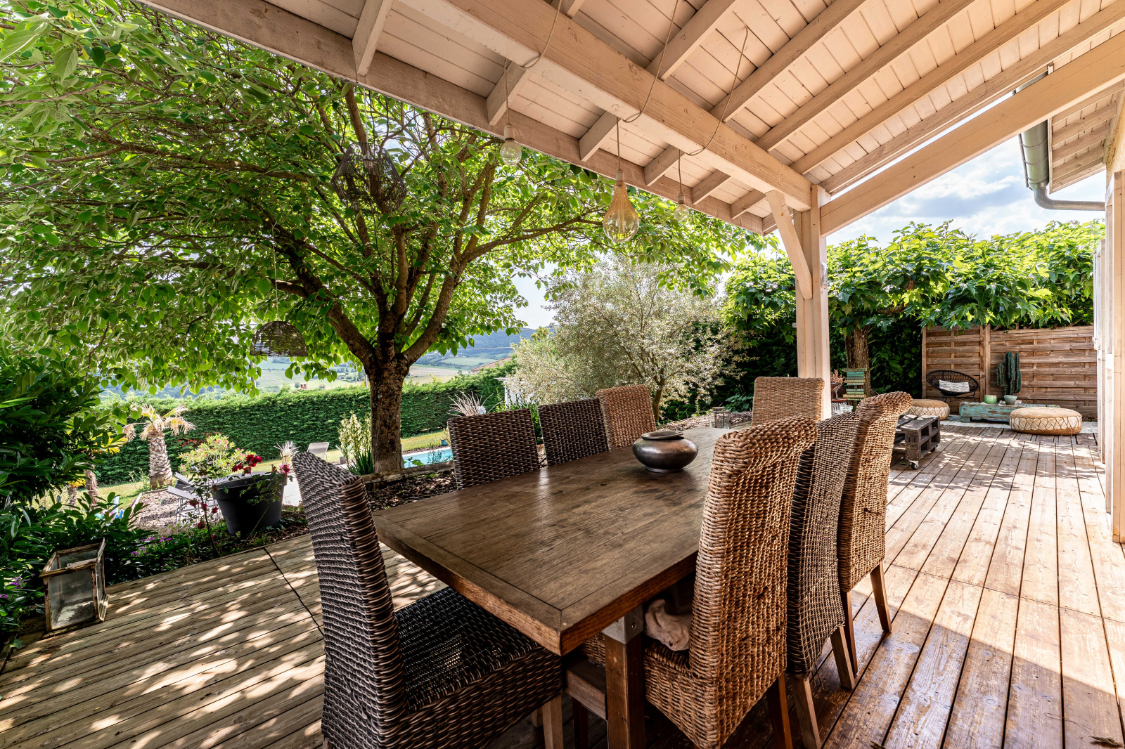 Sur l'extérieur, un jardin clos et arboré avec terrasses, piscine, pool house et plusieurs places de parking.