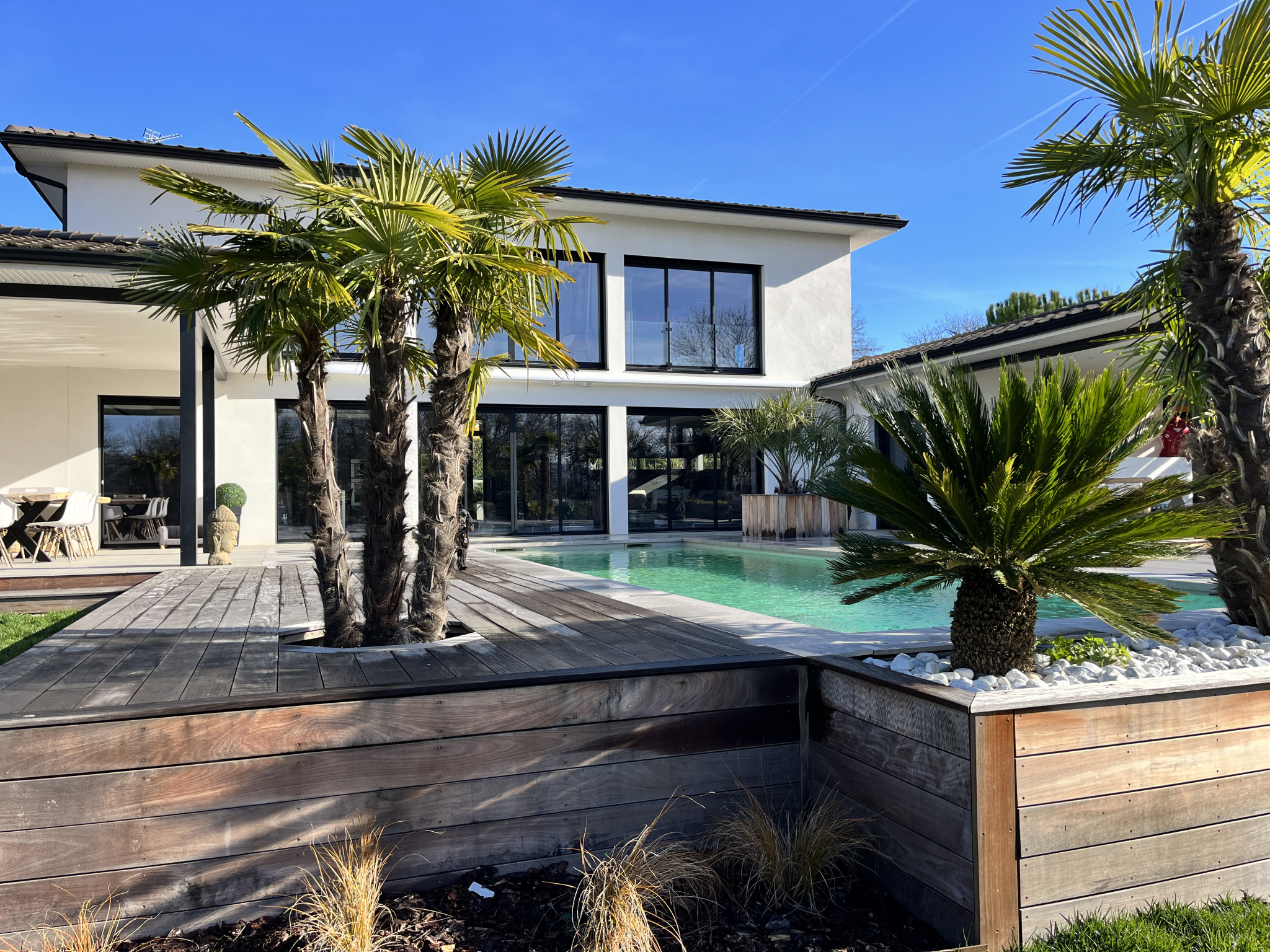 La maison se compose d'une belle entrée vitrée toute hauteur avec vestiaire, d'une magnifique pièce de vie avec cuisine équipée, salle à manger et double salon vous mènent sur la piscine. Baigné de lumière par les larges baies vitrées, cet espace de vie donne accès à une master bedroom avec dressing et salle de bain privative.