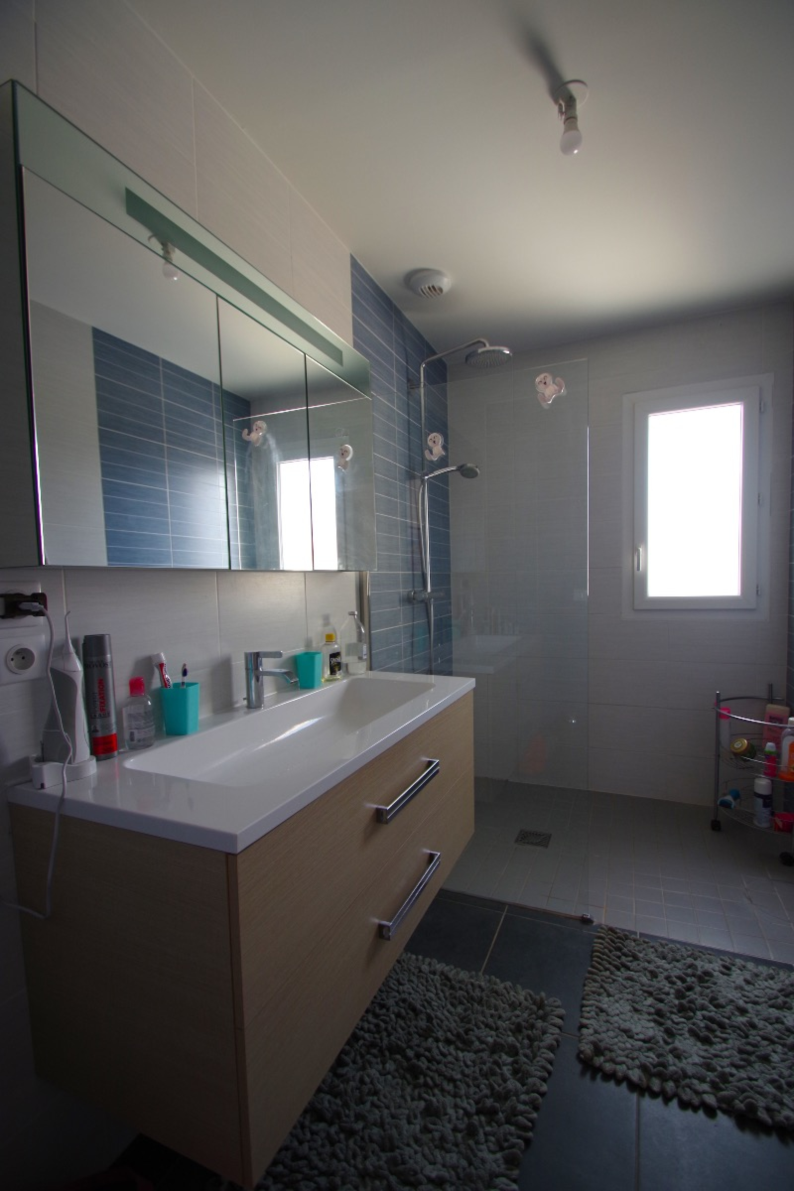 Maison en RT 2012 de plain-pied sur un terrain de 540 m2 avec un garage fermé avec mezzanine et un abris voiture.